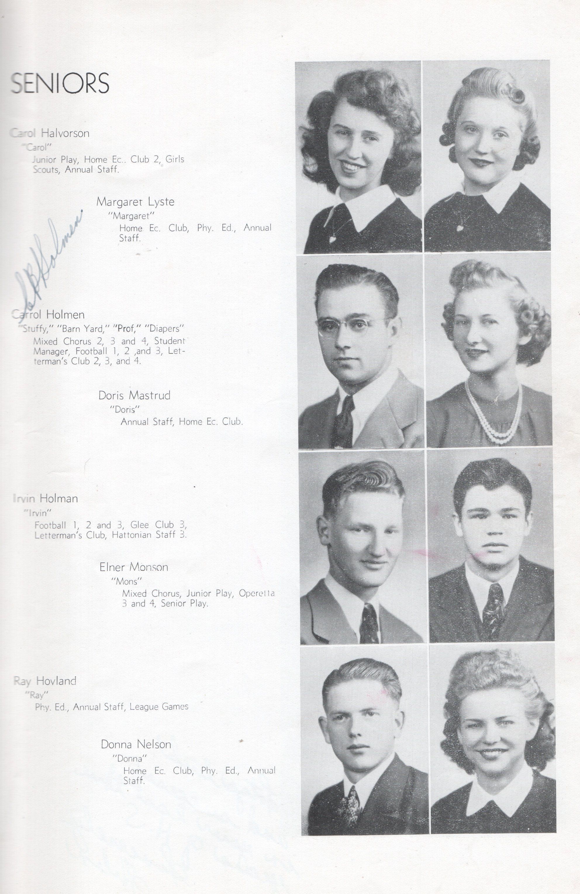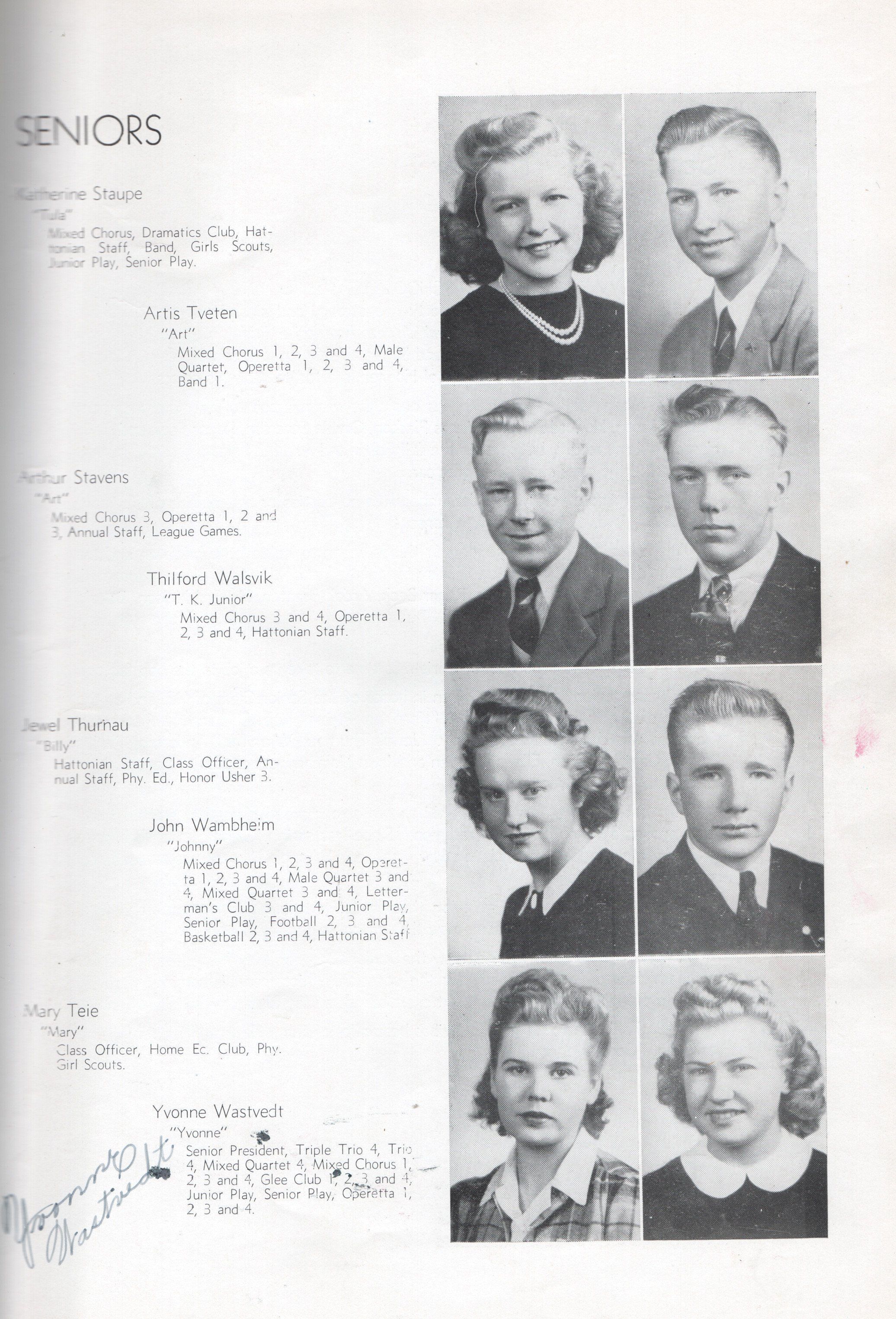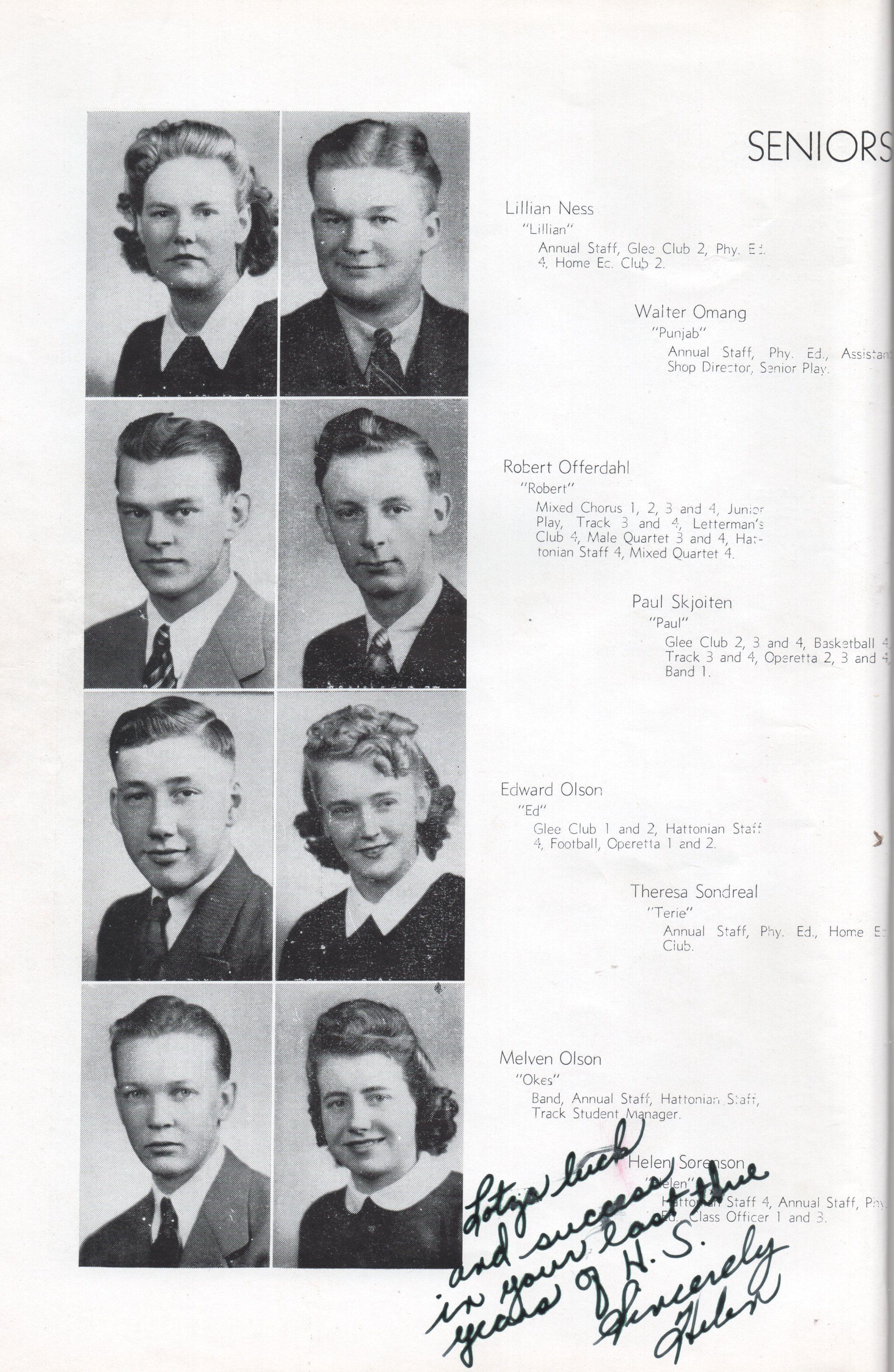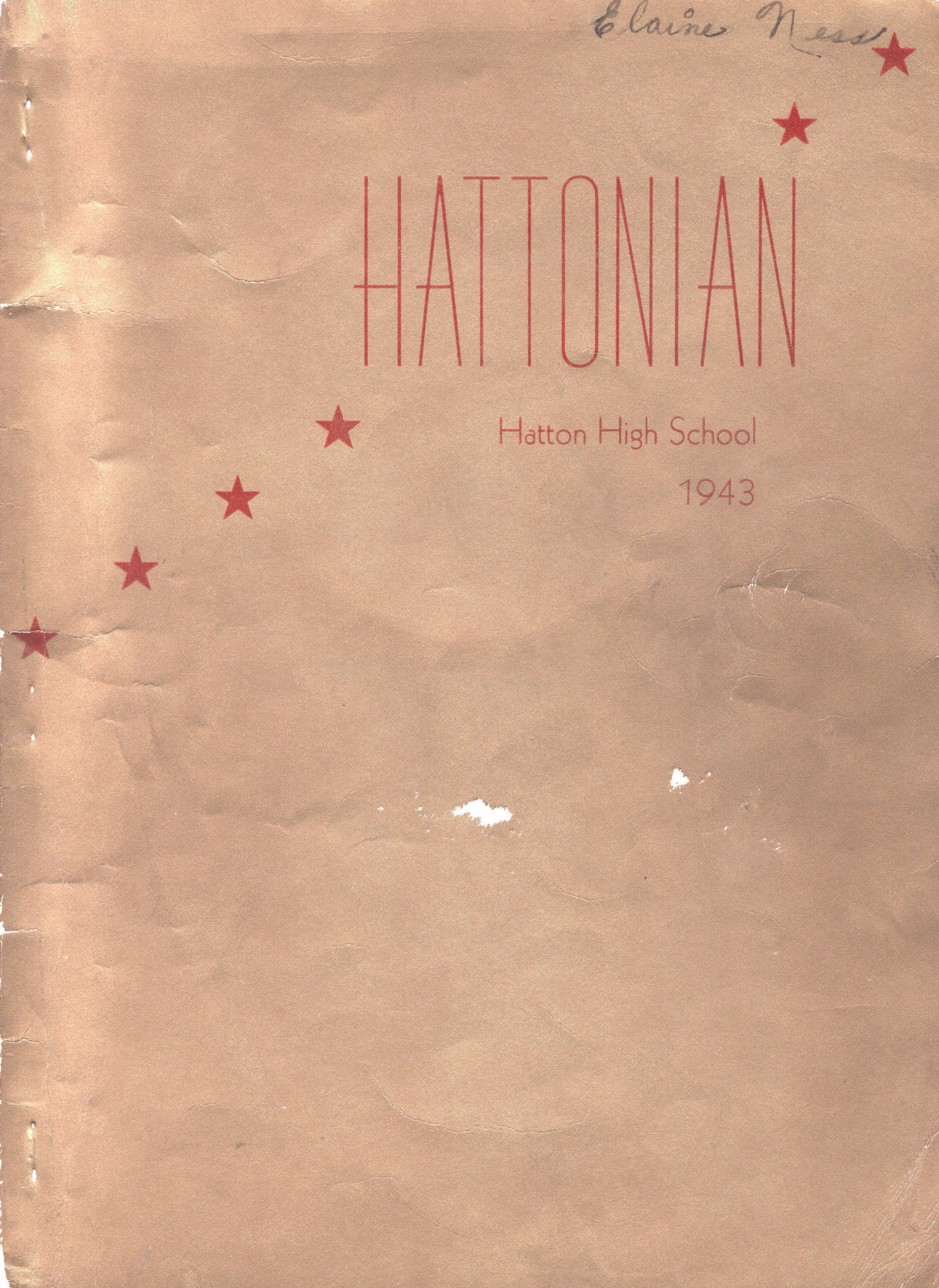 The Class of 1943 Hatton High School Yearbook, titled Hattonian, was donated to the TCHS Hatton-Eielson Museum by Elaine Ness.