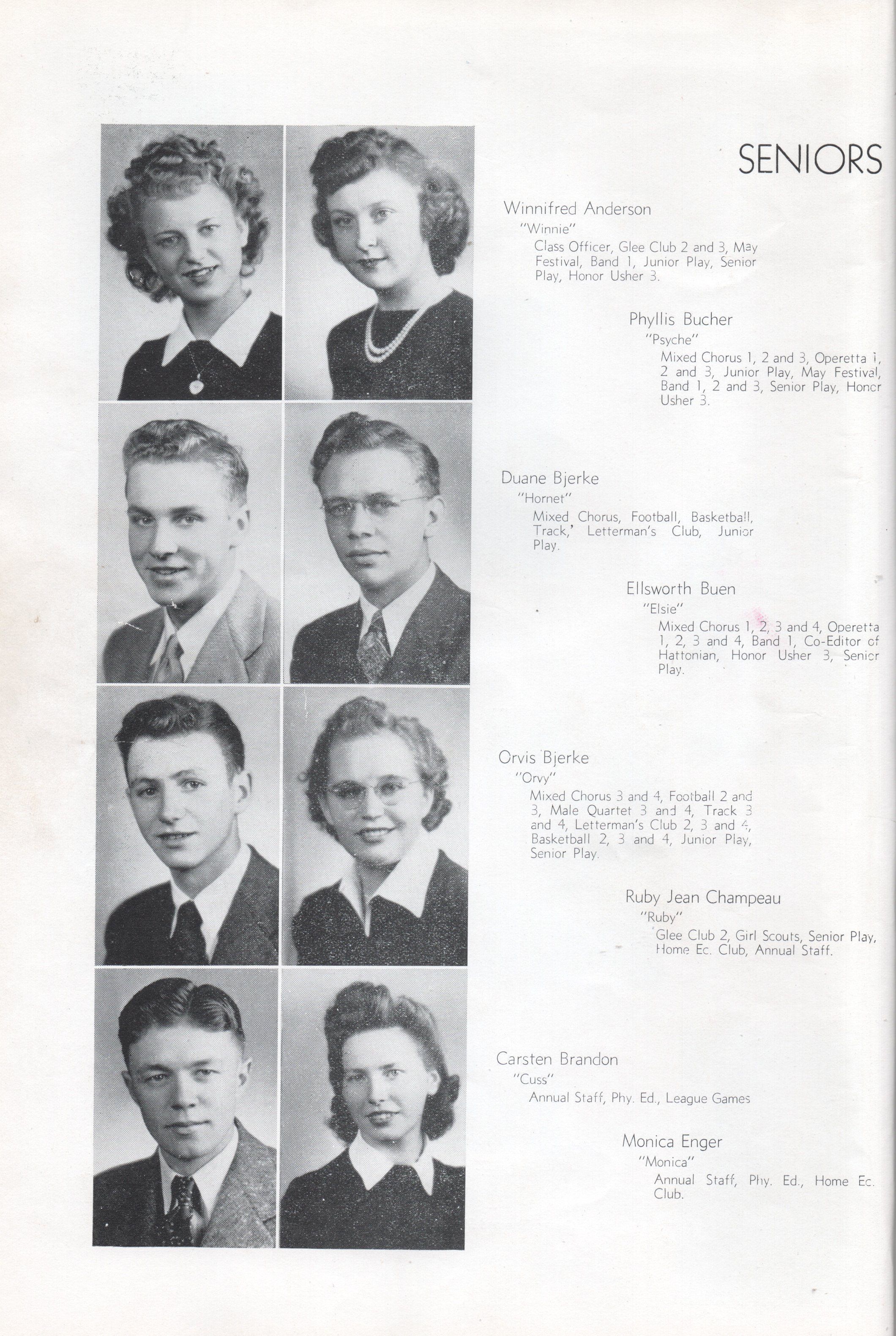 The 1943 yearbook includes four pages of Senior student photographs for: Winnifred Anderson, Phyllis Bucher, Duane Bjerke, Orvis Bjerke, Carsten Brandon, Ellsworth Buen, Ruby Jean Champeau, Monica Enger, Carol Halvorson, Carrol Holmen, Irvin Holman, Ray Hovland, Margaret Lyste, Doris Mastrad, Elner Monson, Donna Nelson, Lillian Ness, Robert Offerdahl, Edward Olson, Melven Olson, Walter Omang, Paul Skjoiten, Theresa Sondreal, Helen Sorenson, Katherine Staupe, Arthur Stavens, Mary Teie, Jewel Thurnau, Artis Tveten, Thilford Walsvik, John Wambheim and Yvonne Wastvedt.