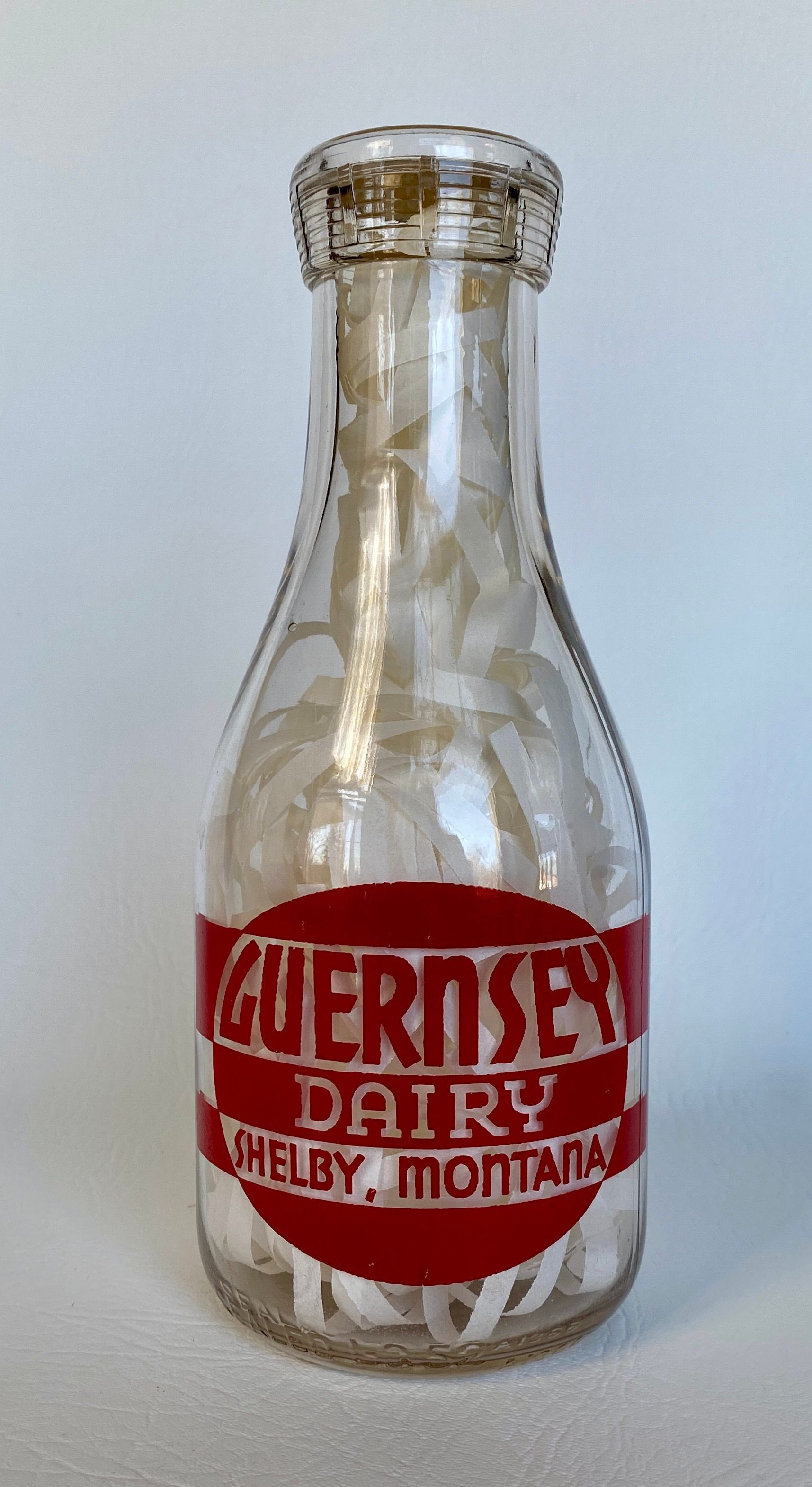 1 Quart Guernsey Dairy Milk Bottle - Shelby, Montana. Used by Dinah Sundby's family in 1940.Cataloged By