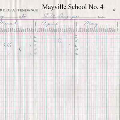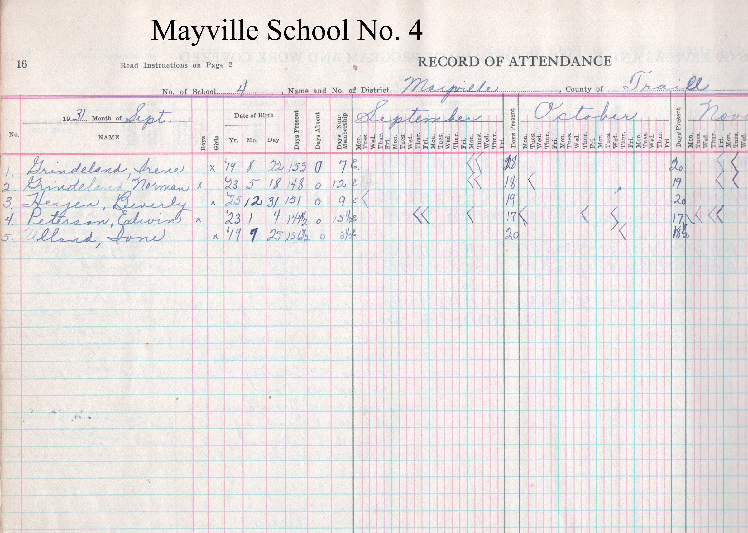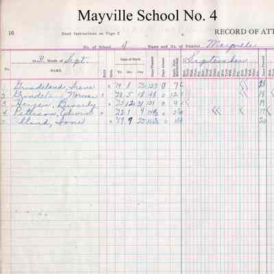 During the 1931-1932 school year, from September to May, Mayville School No. 4 teacher, Carol Mai Langager, kept attendance records for 5 students including Irene Grindeland, Norman Grindeland, Beverly Heyen, Edwin Peterson, and Ione Ulland.Acquisition