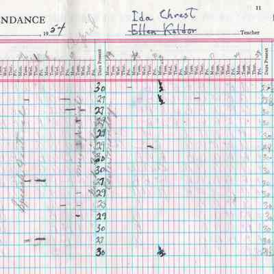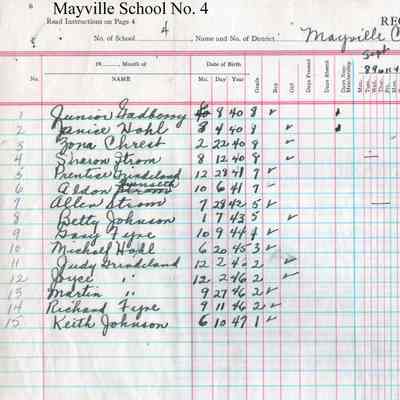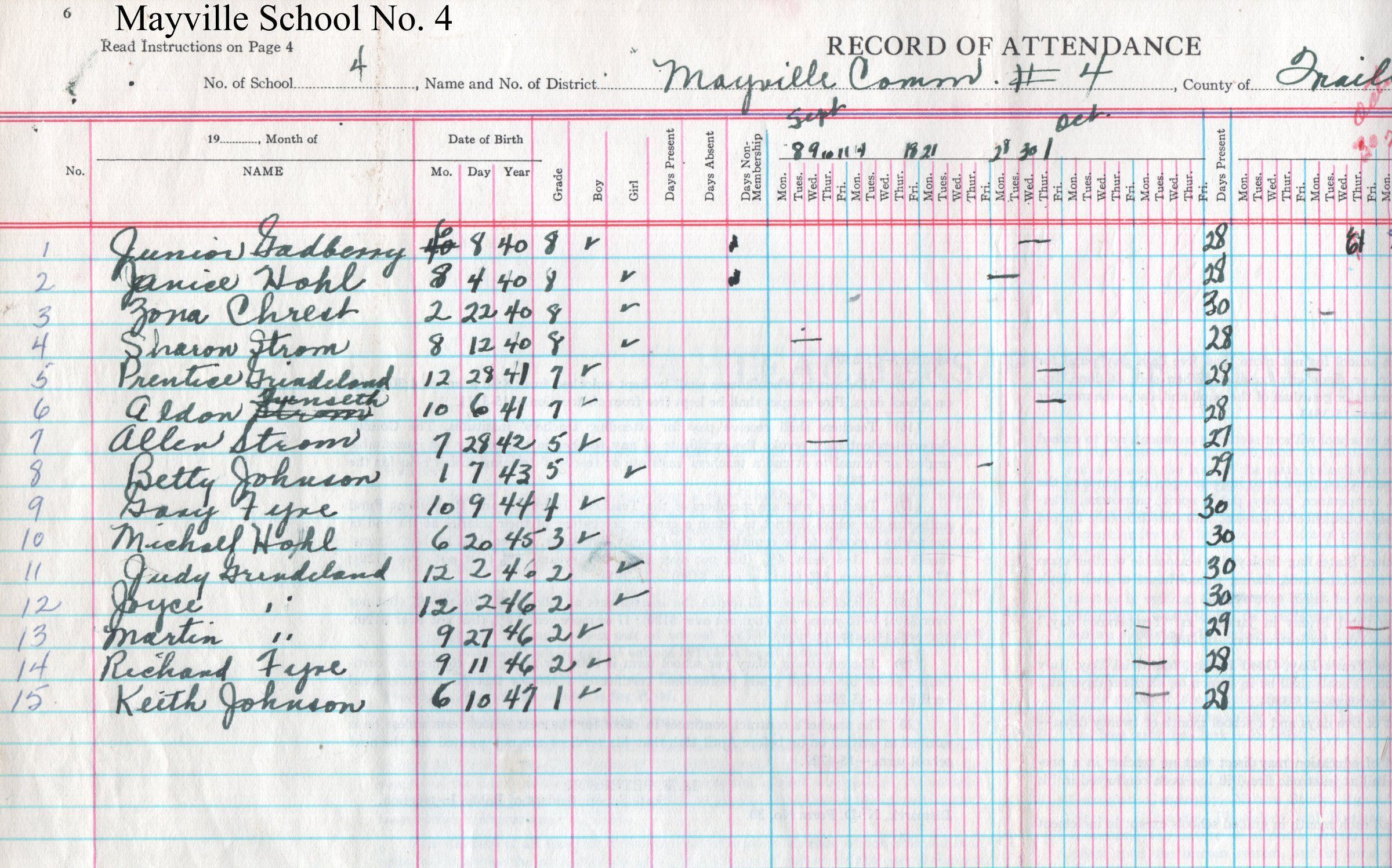 During the 1953-1954 school year, Mayville School No. 4 teacher, Ida Chrest, kept attendance records for 15 students including Zona Chrest, Gary Fyre, Richard Fyre, Joseph ‘Junior’ Gadberry, Joyce Grindeland, Judy Grindeland, Martin Grindeland, Prentice Grindeland, Janice Hohl, Michael Hohl, Betty Johnson, Keith Johnson, Allen Strom, Sharon Strom, and Aldon Tunseth.Acquisition