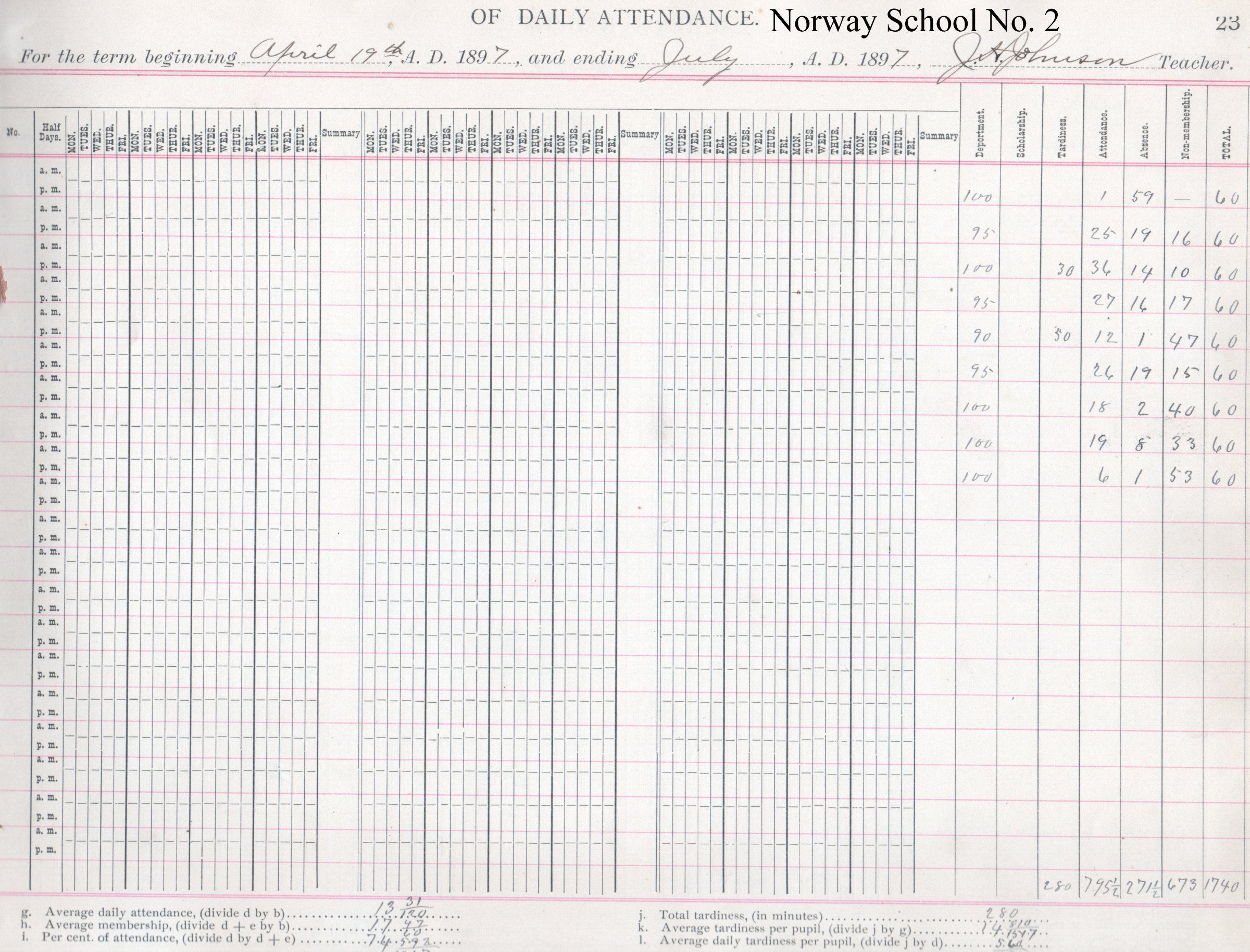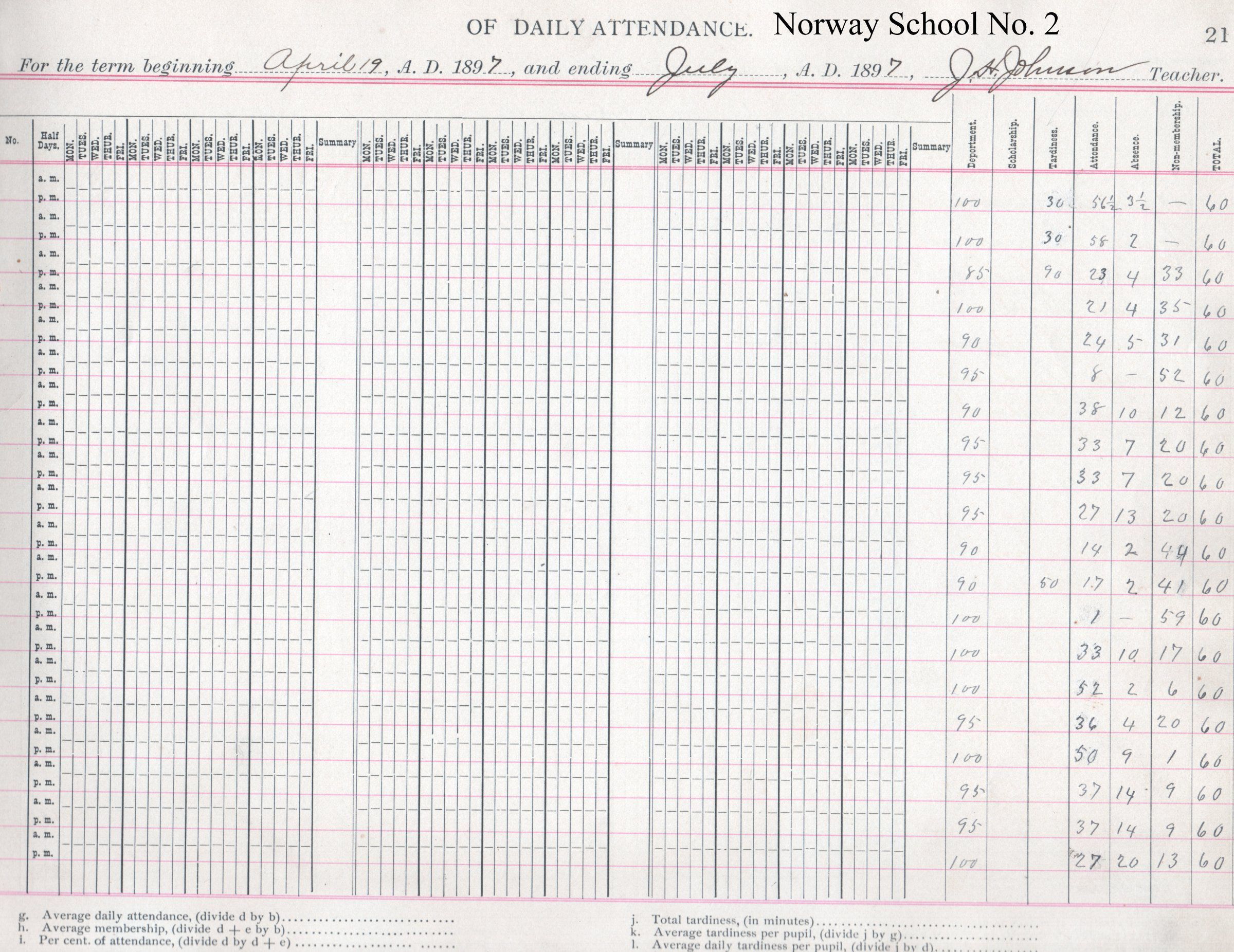 In the Spring-Summer Term of 1897, the Norway No. 2 teacher was J. H. Johnson.