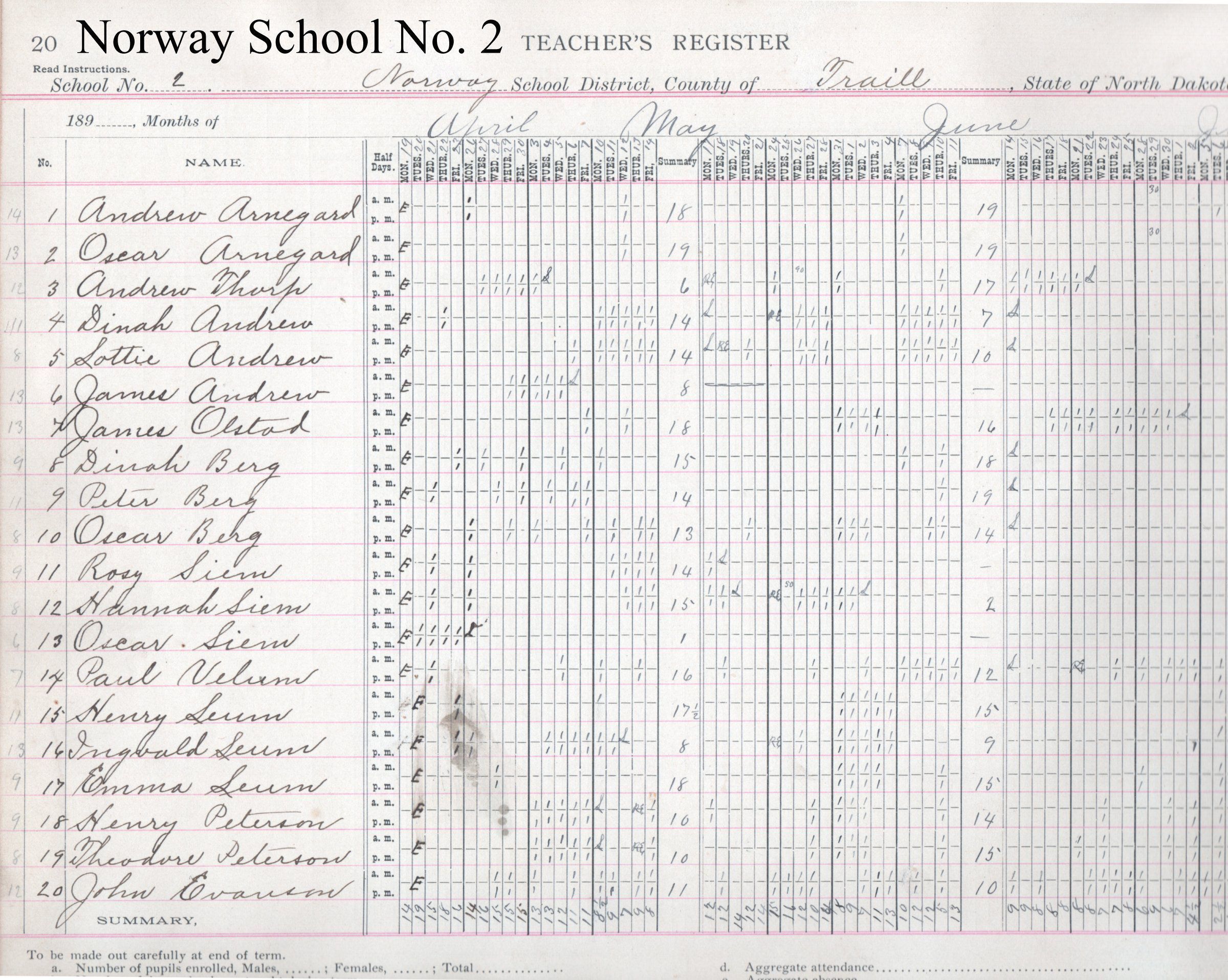 The 1897 Norway School No. 2 Teacher's Registry book was donated to the TCHS where it is available for viewing at the Traill County Museum (Plummer House) in Hillsboro.Acquisition