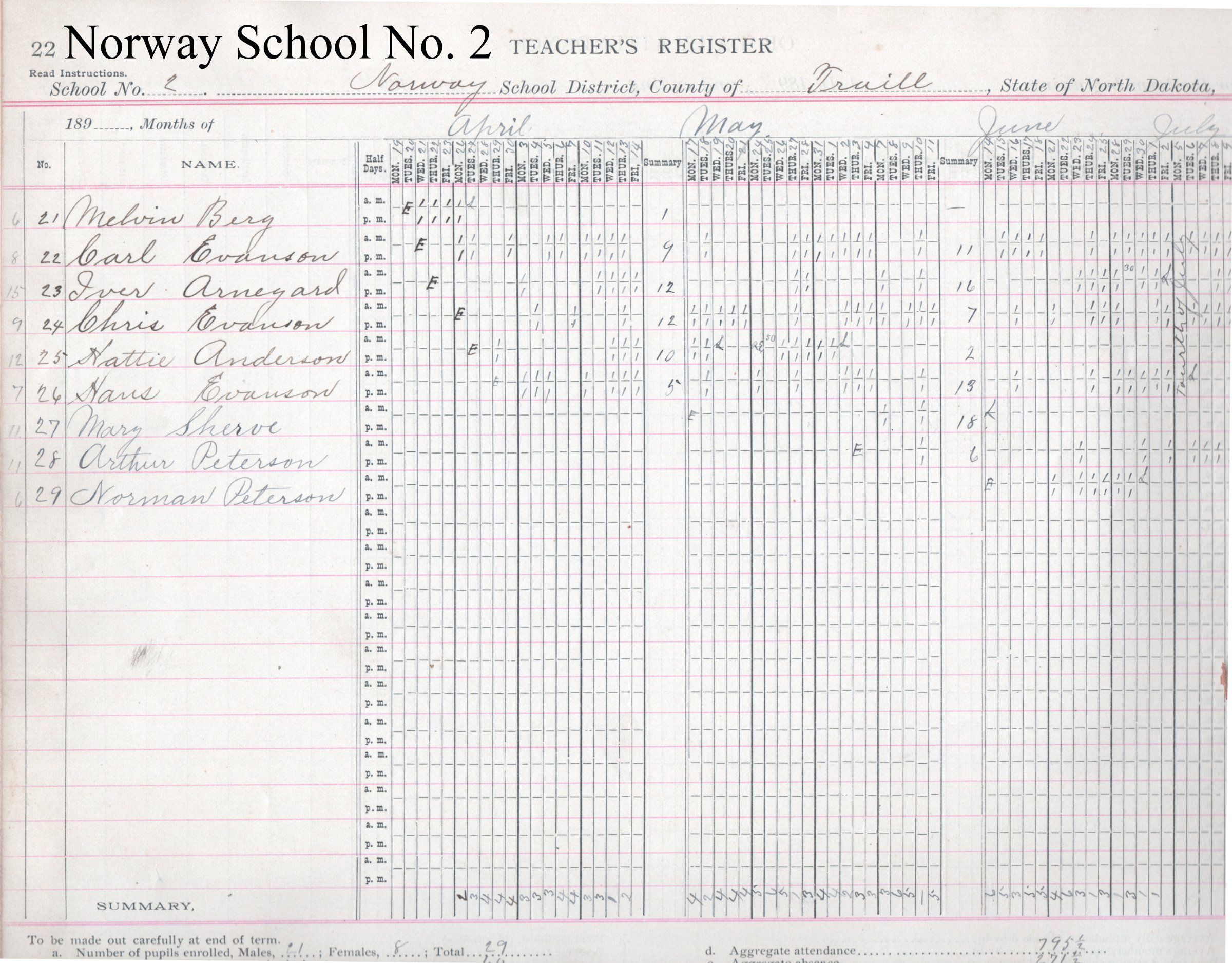 Norway School No. 2, 1897 Teacher's Register, Spring-Summer TermEntry/Object ID