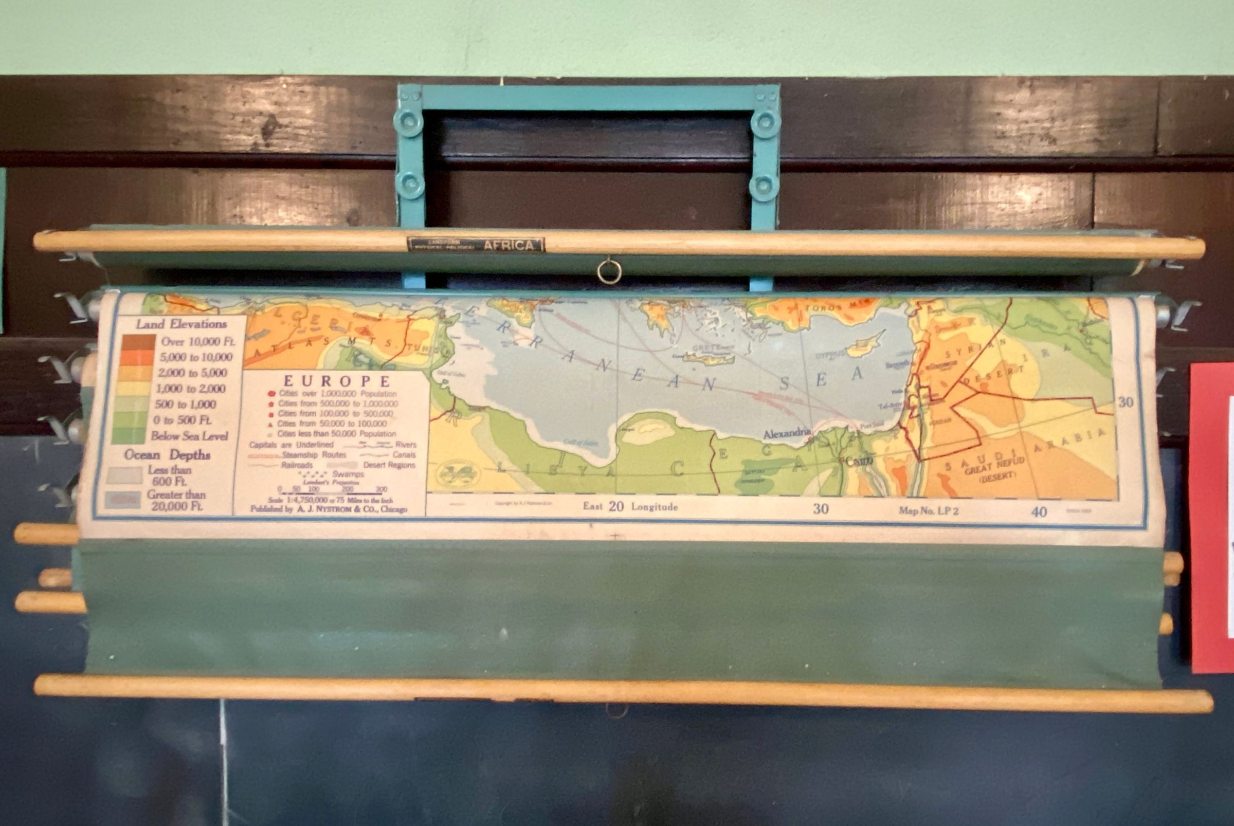 Six Hanging School Wall Maps used in Ervin School District #21. They include Africa, Europe, South America, North America, USA, and North Dakota.Cataloged By