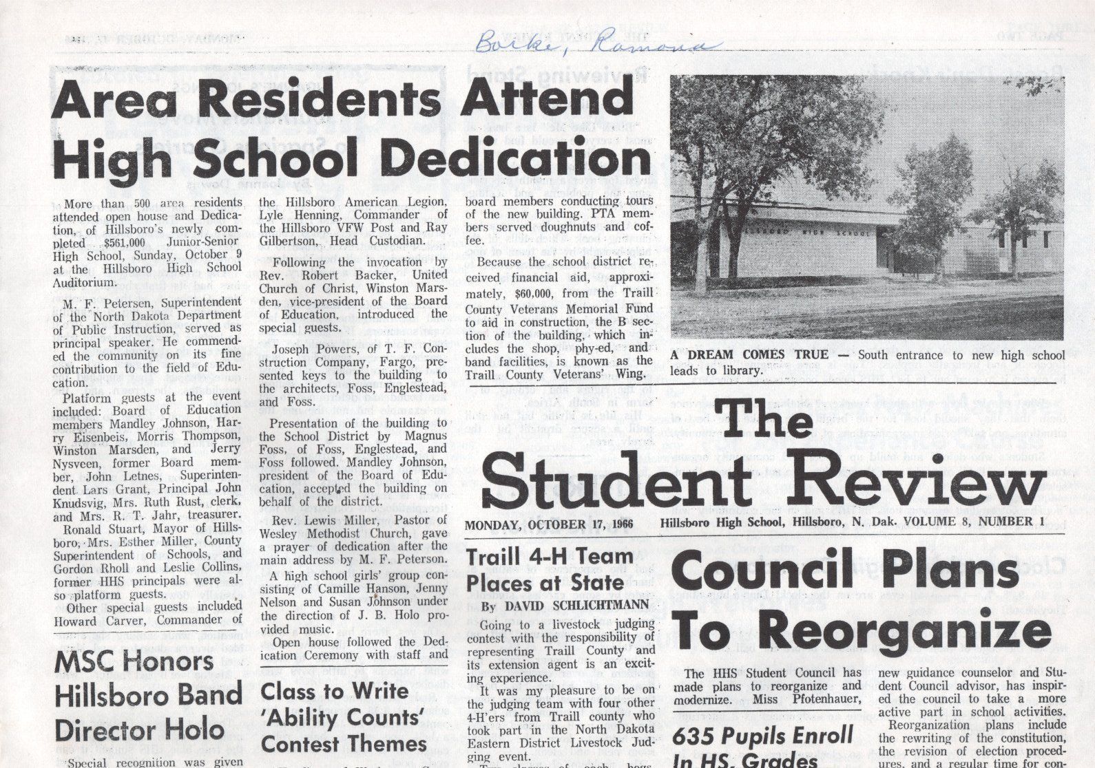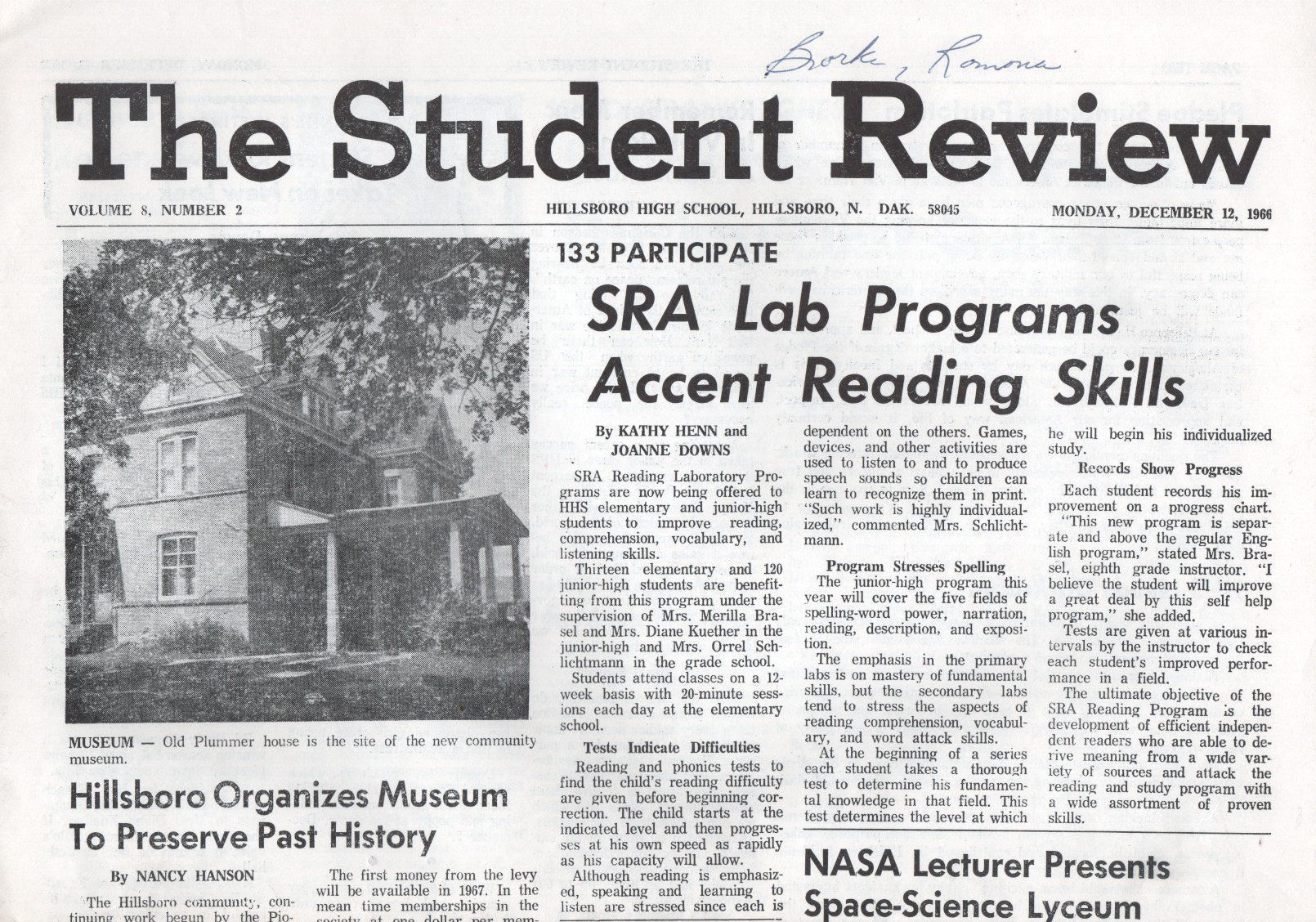 In 1966, from October to December, the Hillsboro High School students published a newspaper titled "The Student Review". The newspaper staff included Joanne Downs and Kathy Henn, Co-Editors; Kenny Cotton, Dale Boeddeker, David Grant, and Charles Hausmann, Business Staff; Linda Nysveen, Sandie Ydstie, Kathy Brennan, Audrey Schornack, Gary Chandler, Linda Preston, Jenny Nelson, Susan Kraby, Mike Kimbrell, Kathy Ellingson, Camilla Hanson, Susan Johnson and Joel Thorsrud, Reporters; Elizabeth Vettel, Kathy Meyer, Terry Larson, and Mary Manger, Copy and Proofreaders; John Aker, David Schlichtmann, Steve Carnal, Neil Boeddeker, and Steven Aasen, Sports; Tim Wright, Terry Kritzberger, Ed Ackerman, Paul Willison, Patty Winberg, Eline Berg and Diane Jahnke, Circulation; and Joyce Orvick, Julie Rohman, Patty Fleischer, Mary Halvorson, and Leonette Schultz, Typists.