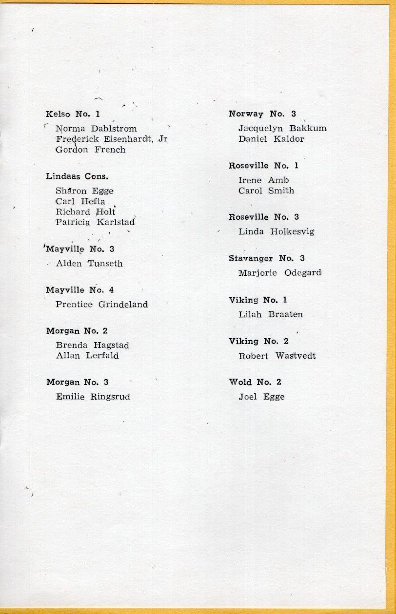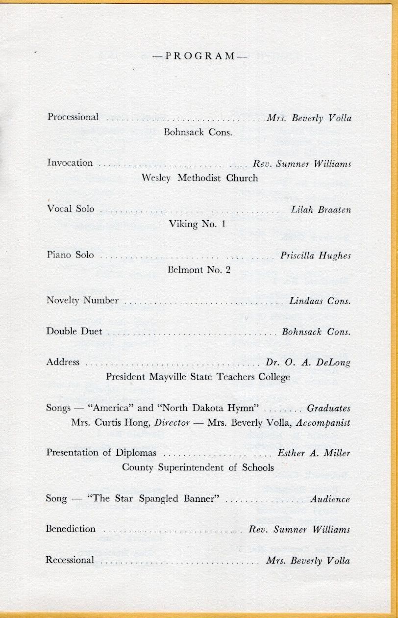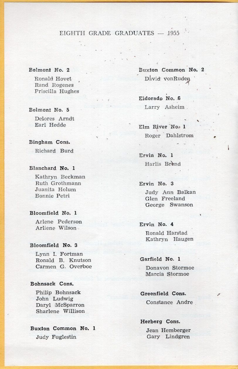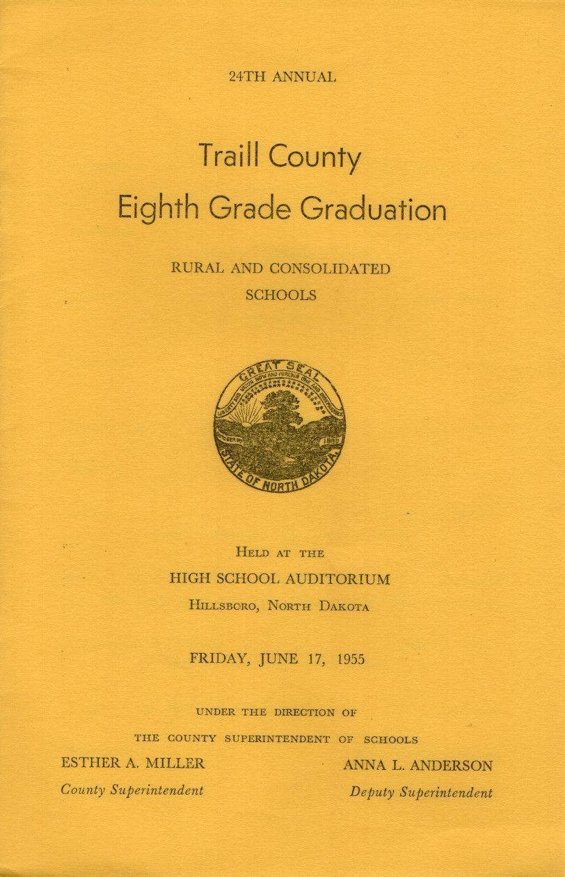 On 17 June 1955, Traill County Superintendent of Schools, Esther Miller, directed the 24th Annual Eighth Grade Graduation program for rural and consolidated schools, which was held at the Hillsboro High School Auditorium. The program for rural school graduates began with a Processional and ended with a Benediction and Recessional. Songs on the back cover were sung during the Program.