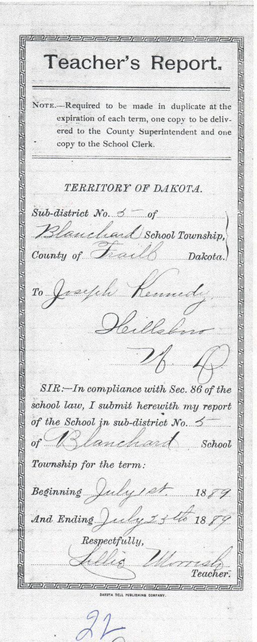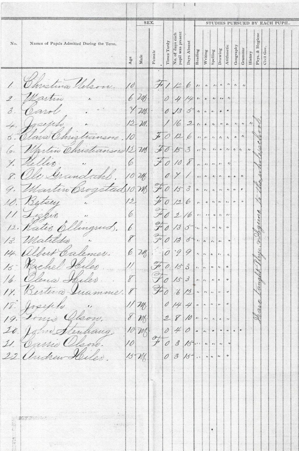 In the 1889 Summer Term (1-23 July), Blanchard School No. 5 teacher Lillie Morrish reported attendances and studies pursued for 22 students, including Albert Calemer, Clara Christenson, Martin Christenson, Nellie Christenson, Betsy Crogstad, Lizzie Crogstad, Martin Crogstad, Katie Ellingrud, Matilda Ellingrud, Ole Grondahl, Andrew Hiler, Olena Hiler, Rachel Hiler, Bertena Iuamme, Joseph Iuamme, Carol Nelson, Christina Nelson, Joseph Nelson, Martin Nelson, Carrie Olson, Louis Olson and John Stenhaug.