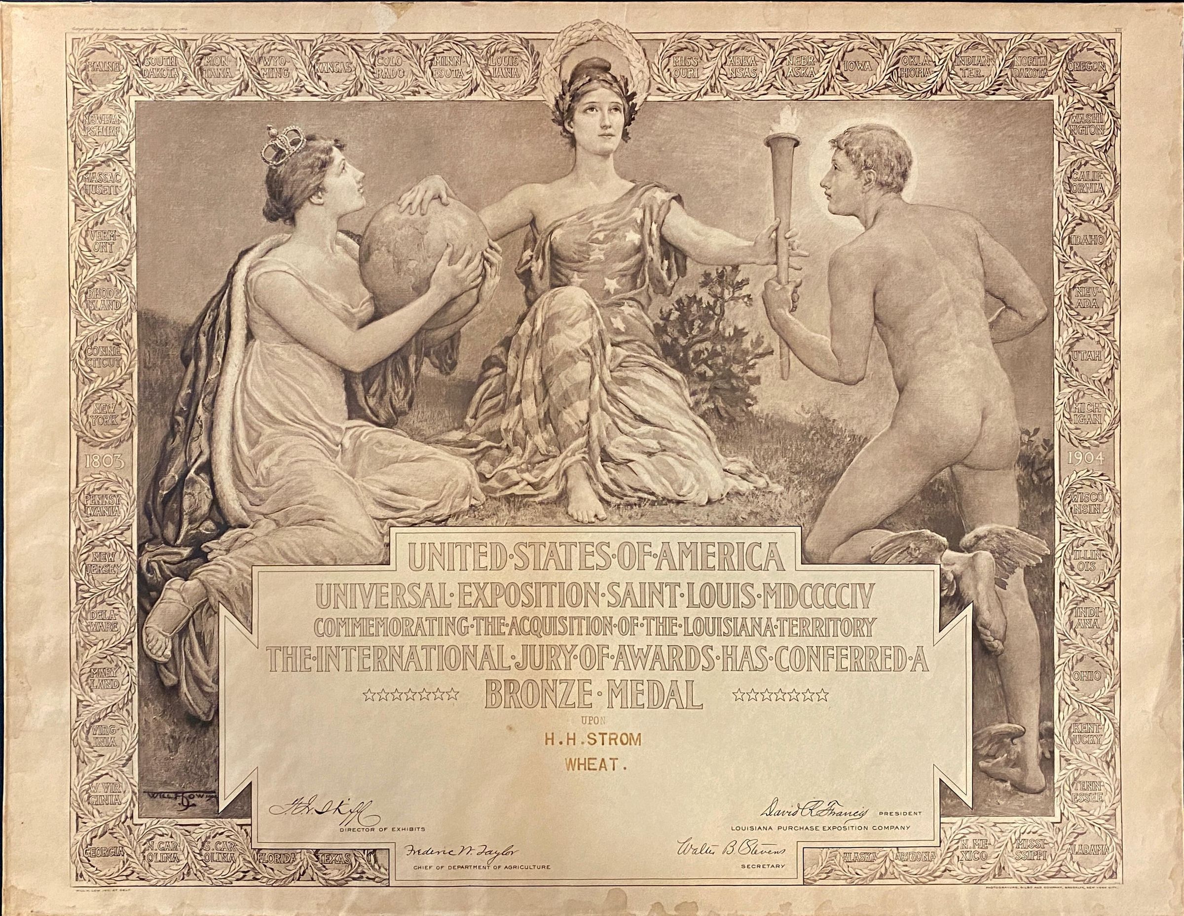Document which awards the bronze medal for wheat to H. H. Strom at the USA Universal Exposition held in St. Louis. This to commemorate the acquisition of the Louisiana Territory.