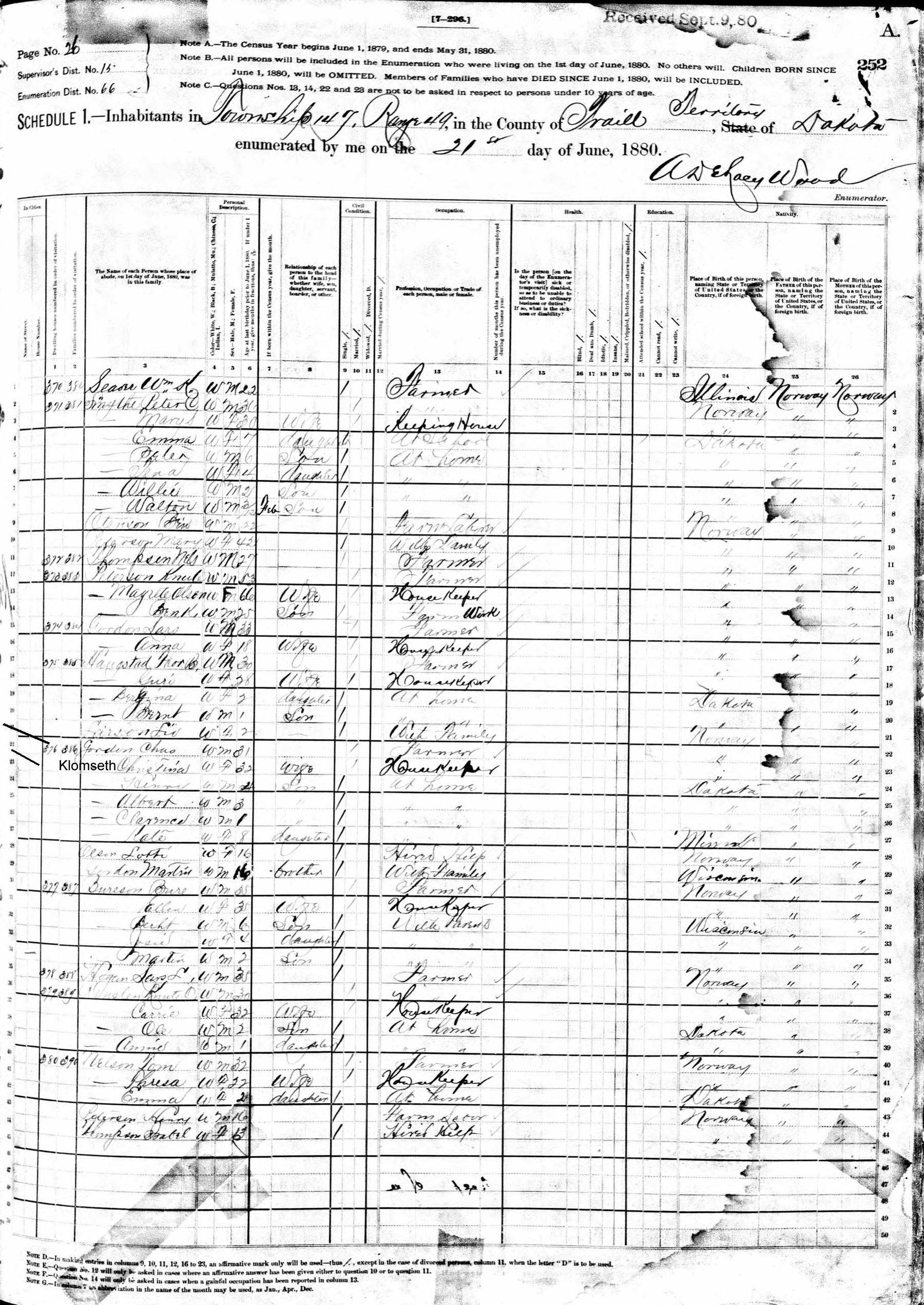 In the 1880 US Census for N Caledonia (later Bingham) Township (below), Chas Gordon's occupation was recorded as "Farmer". Chas and Karen (Christina) Gordon are listed with four children: Kate (age 8), Henry (4), Albert (3), and Clarence (1). Chas Gordon's brother, Martin Gordon, age 16, is also listed with them, as well as "Hire help" Lotti Olson", age 16.