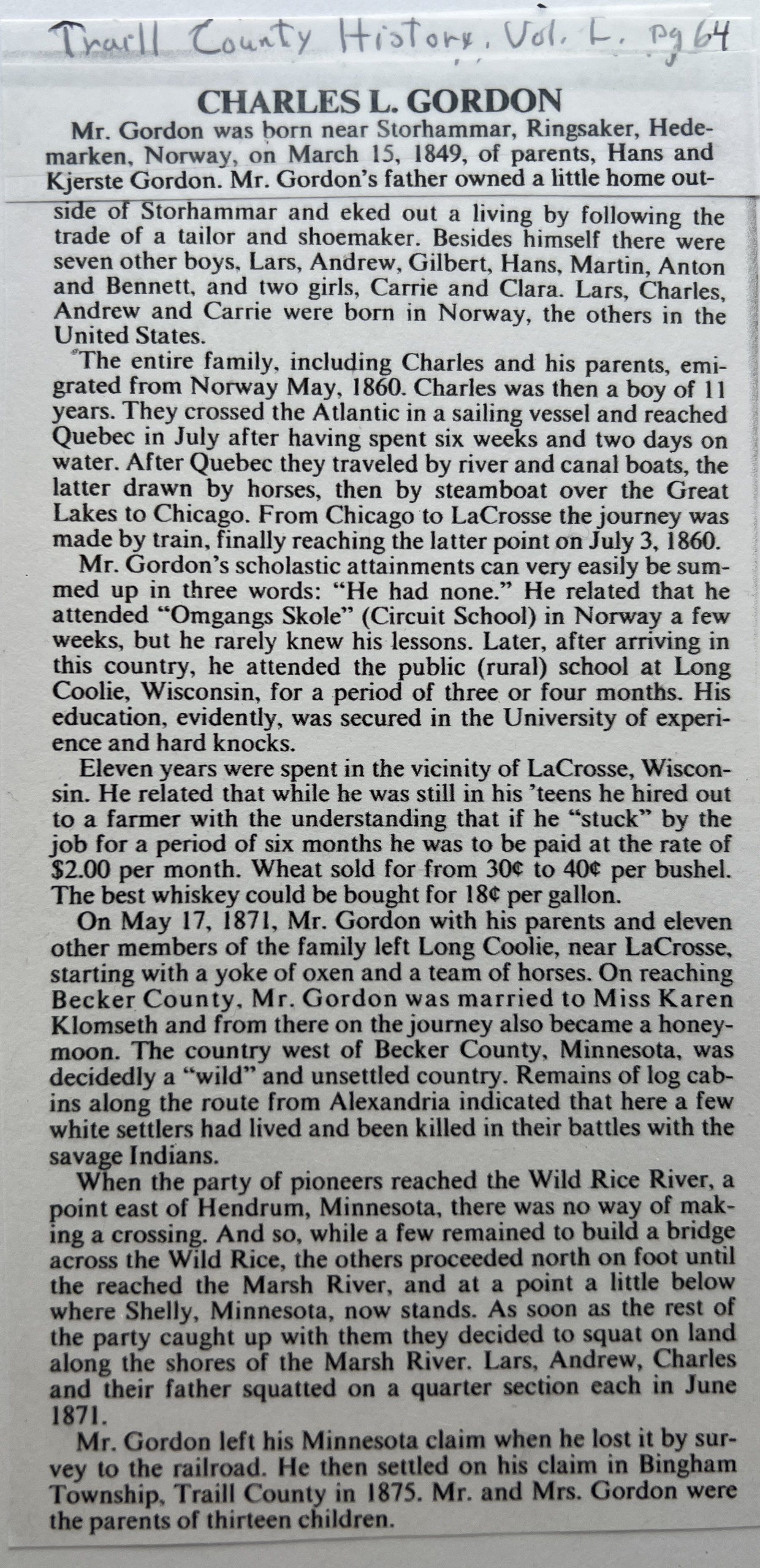 As described on page 64 in Yesteryears, in 1860, Chas came to America with his parents and siblings They first settled in La Crosse County, WI. In 1871, they moved to new lands available in the Red River Valley of Minnesota and the Dakota Territory. As they travelled through Becker County, Minnesota, Chas L. Gordon married Miss Karen Klomseth. They continued on and Chas, his father Hans, and brothers Lars and Andrew, settled on claims along the March River near what became the town of Shelly, Minnesota. These claims were later disrupted by a survey for a new railroad, so Chas and Lars Gordon moved west across the Red River and took claims in Traill County, DT.