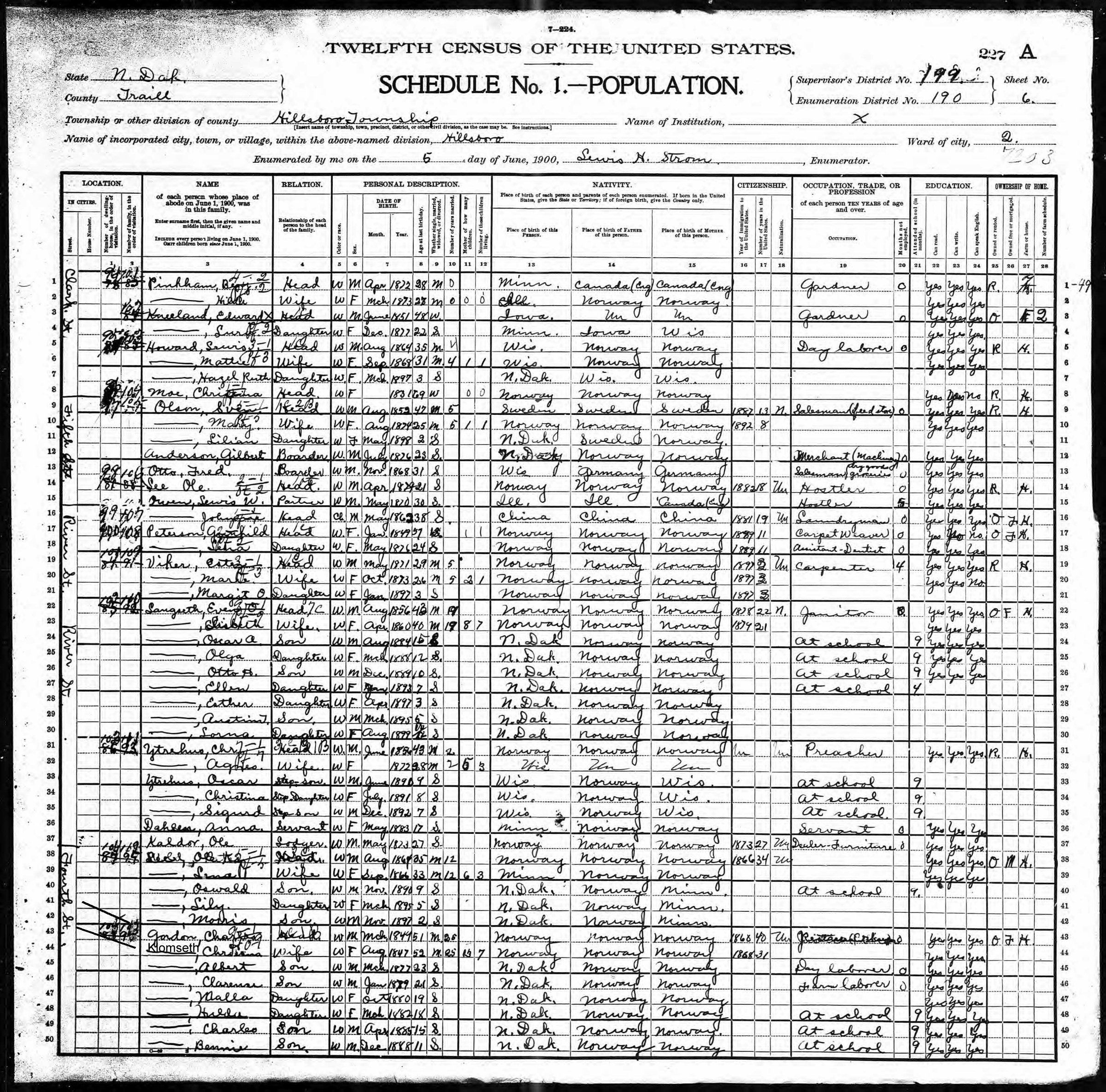 In the 1900 US Census (below), Chas and Karen (Christina) were residing in the City of Hillsboro. Their house was number 5 on Fourth Street, the same address as given for Chas Gordon's brother Lars Gordon in 1900. Chas Grodon's occupation was recorded as "janitor, preacher". in 1900, six children were listed with Chas and Christina: Albert, Clarence, Malla (Mollie), Hulda, Charles and Bennett (Bennie).