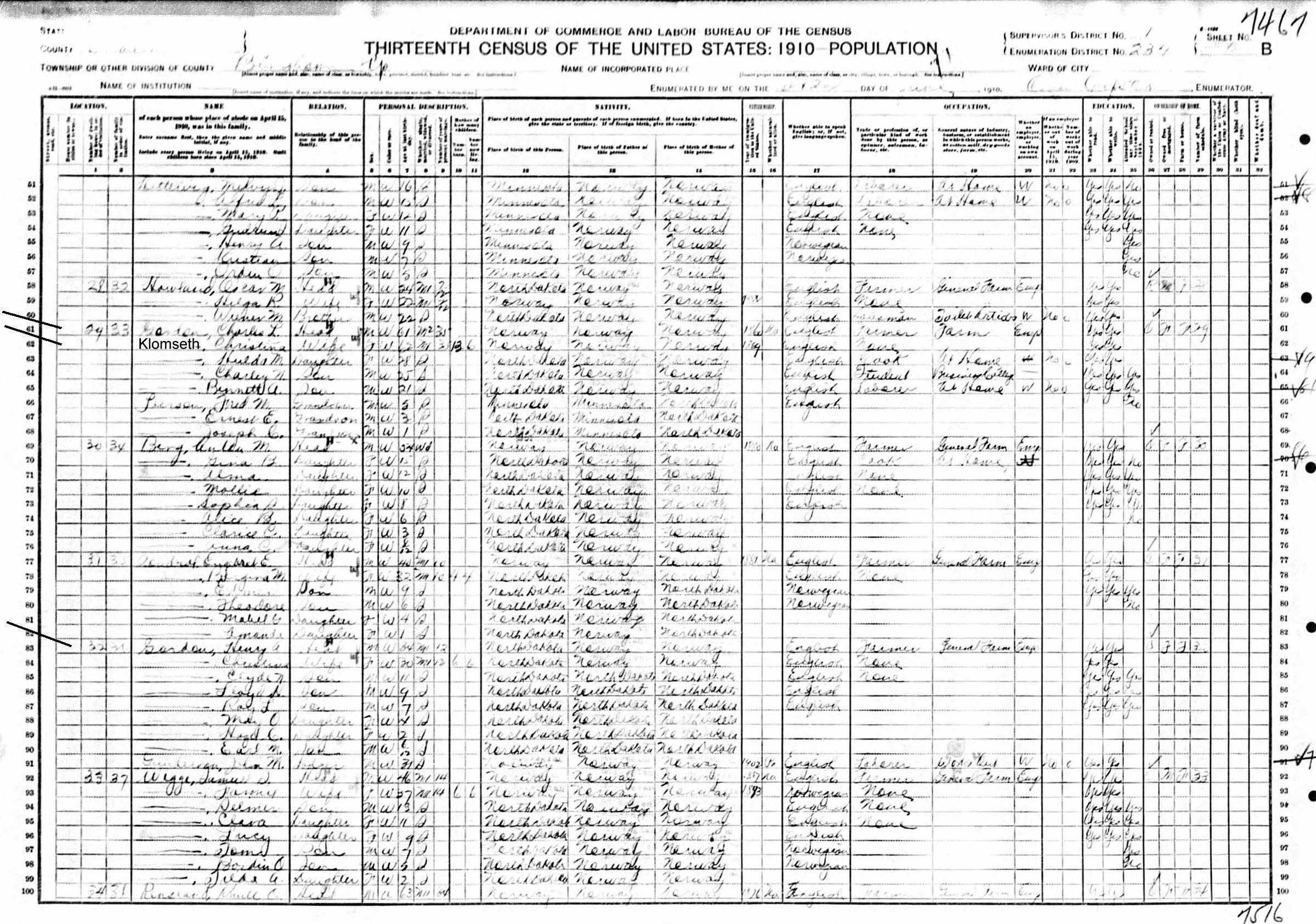 By the 1910 US Census for Bingham Township (below), Chas and Karen (Christina) Gordon were listed with three children: Hulda, Charley, and Bennett, and three grandsons, Fred, Ernest and Joseph Peerson, children of Chas and Karen's daughter Mollie (see descendants' chart).