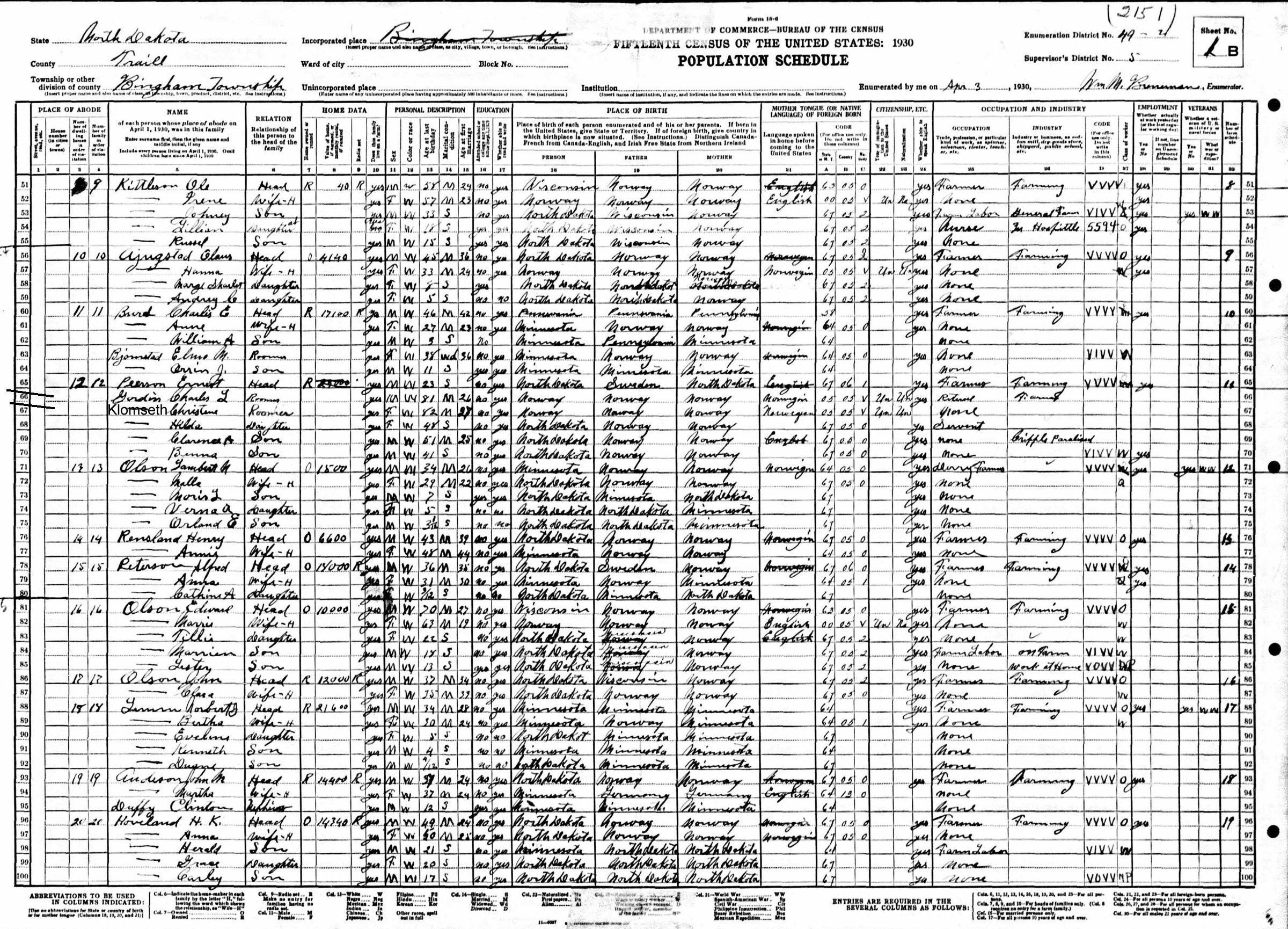 In the 1930 for Bingham Township (below), Chas, age 81, and Karen (Christina), age 82, were recorded in the household of their grandson, Ernest Peerson, who apparently was renting their farmland. Chas and Christina's daughter, Hulda (age 48), and sons, Clarence (51) and Bennett (41) were also in the household.