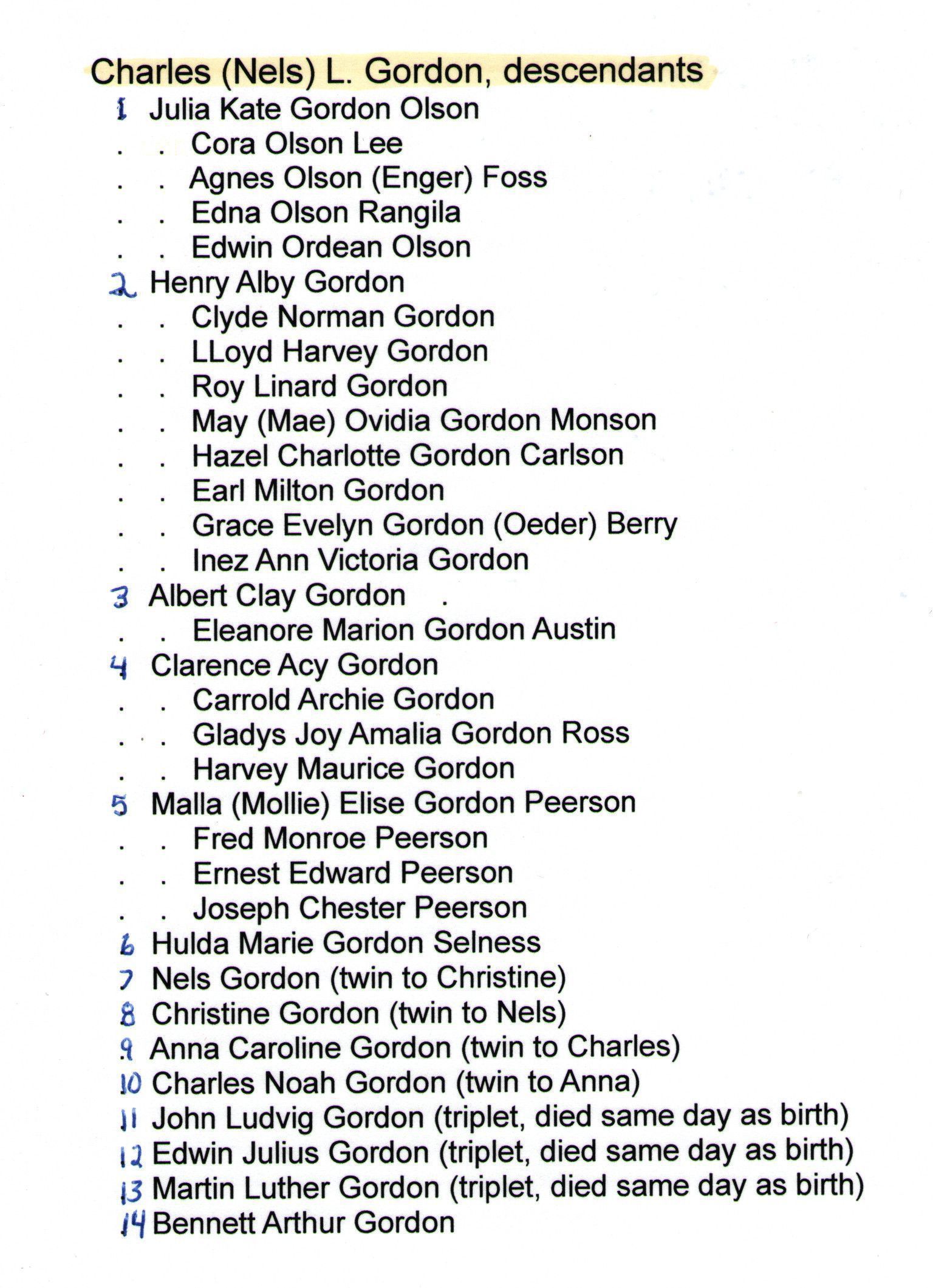 Chas and Karen Gordon had a toral of 14 children, as shown in a descendant's chart (below).