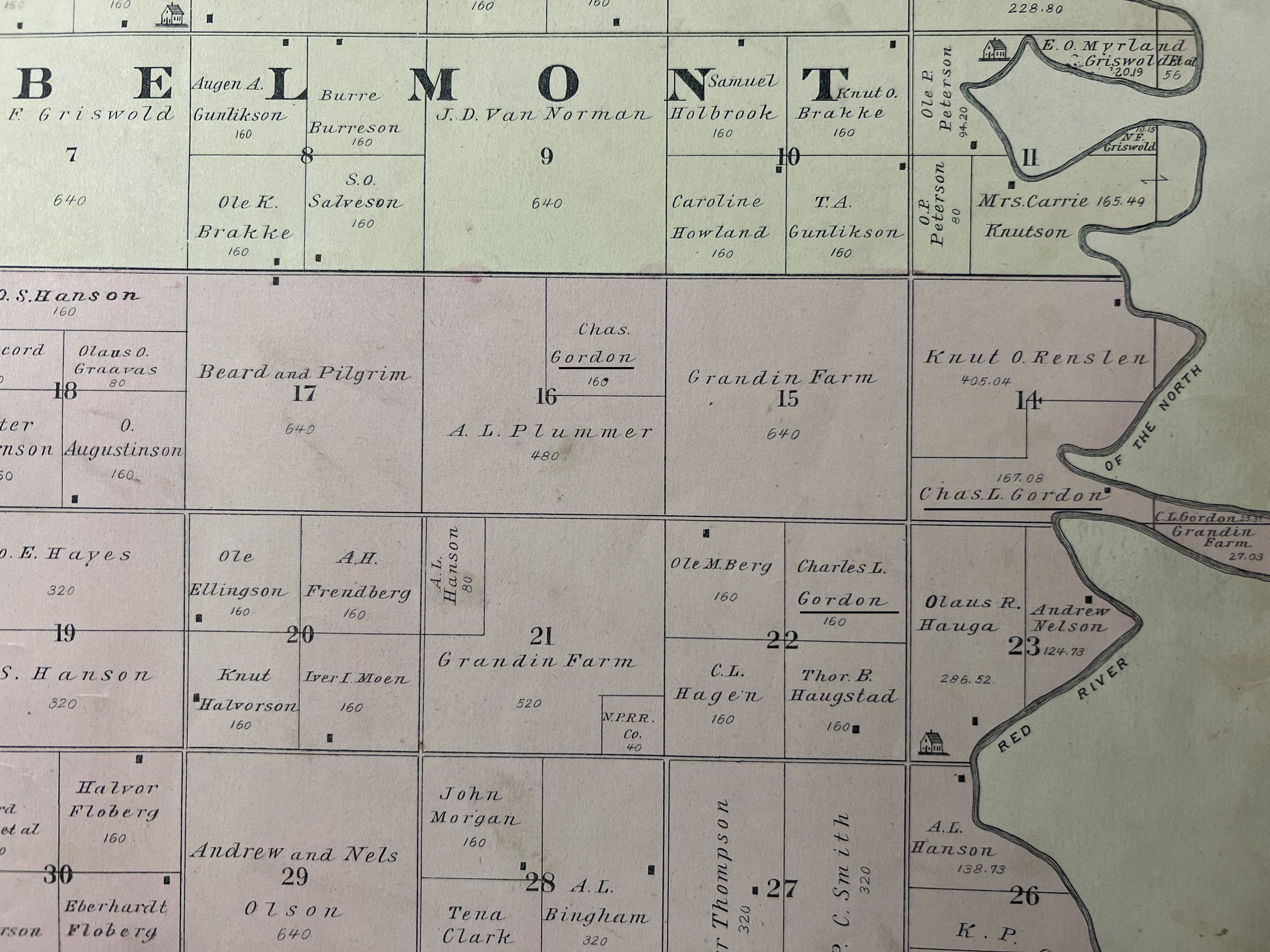 As shown in an 1892 Atlas plat map for N. Caledonia (below), Chas L. Gordon took three claims of land in N. Caledonia Township, which later became Bingham Township. Chas Gordon had land in Sections 14, 16 and 22. The homestead was located in Section 14 along the Red River.