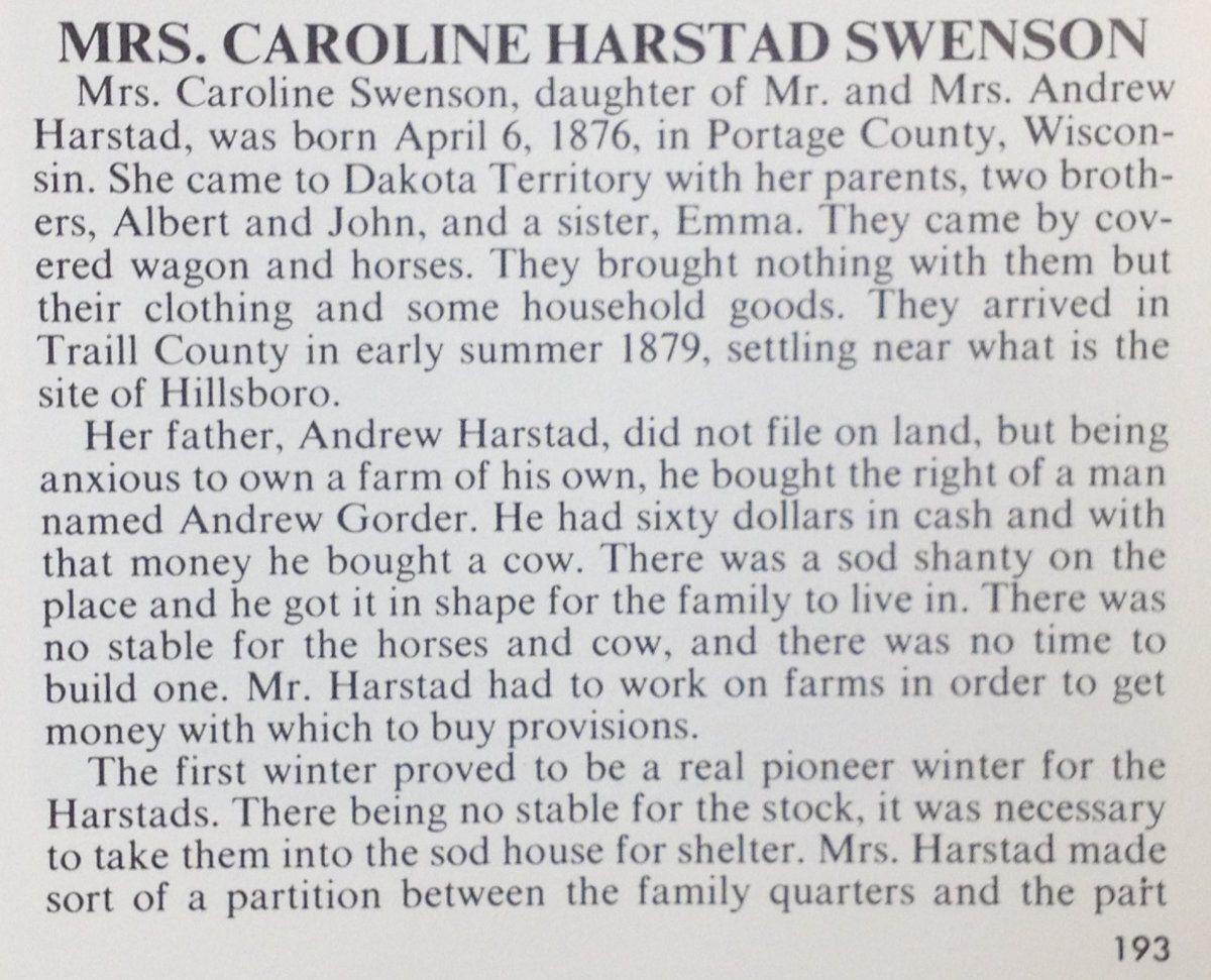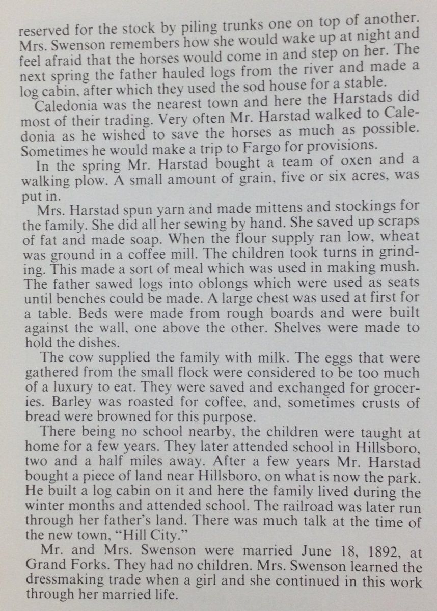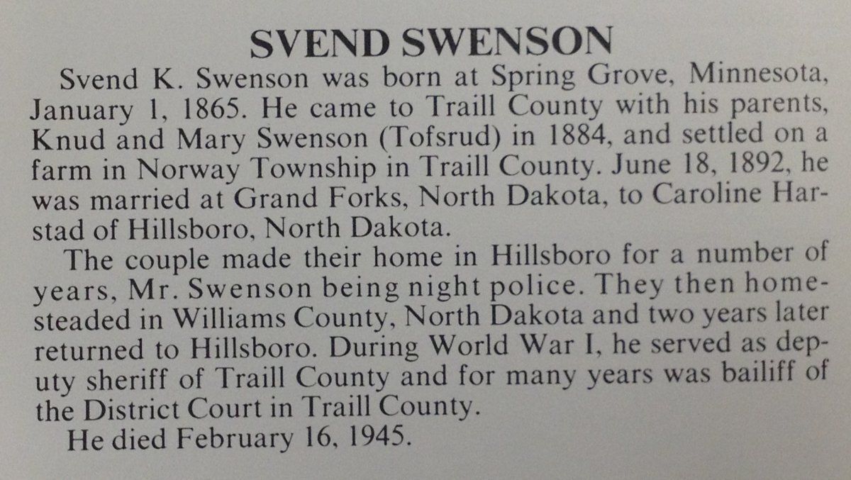 This folder contains selected pages from a history of Swen (Svend) and Caroline (Haarstad) Swenson, son of Knud and Mari (Solum) Swenson, as described on page 70 in the book "A family History for Hannah [Swenson] and John E. Ludwig, Residents of Hillsboro, North Dakota, USA, in the late 1800s and early to mid-1900s" written in 2016 by John A. Ludwig, which is available in the TCHS Resource room, Plummer House, Hillsboro, ND. Swen served as a policeman and deputy sheriff in Hillsboro, Traill County, ND. Caroline as a skilled professional dressmaker.Cataloged By