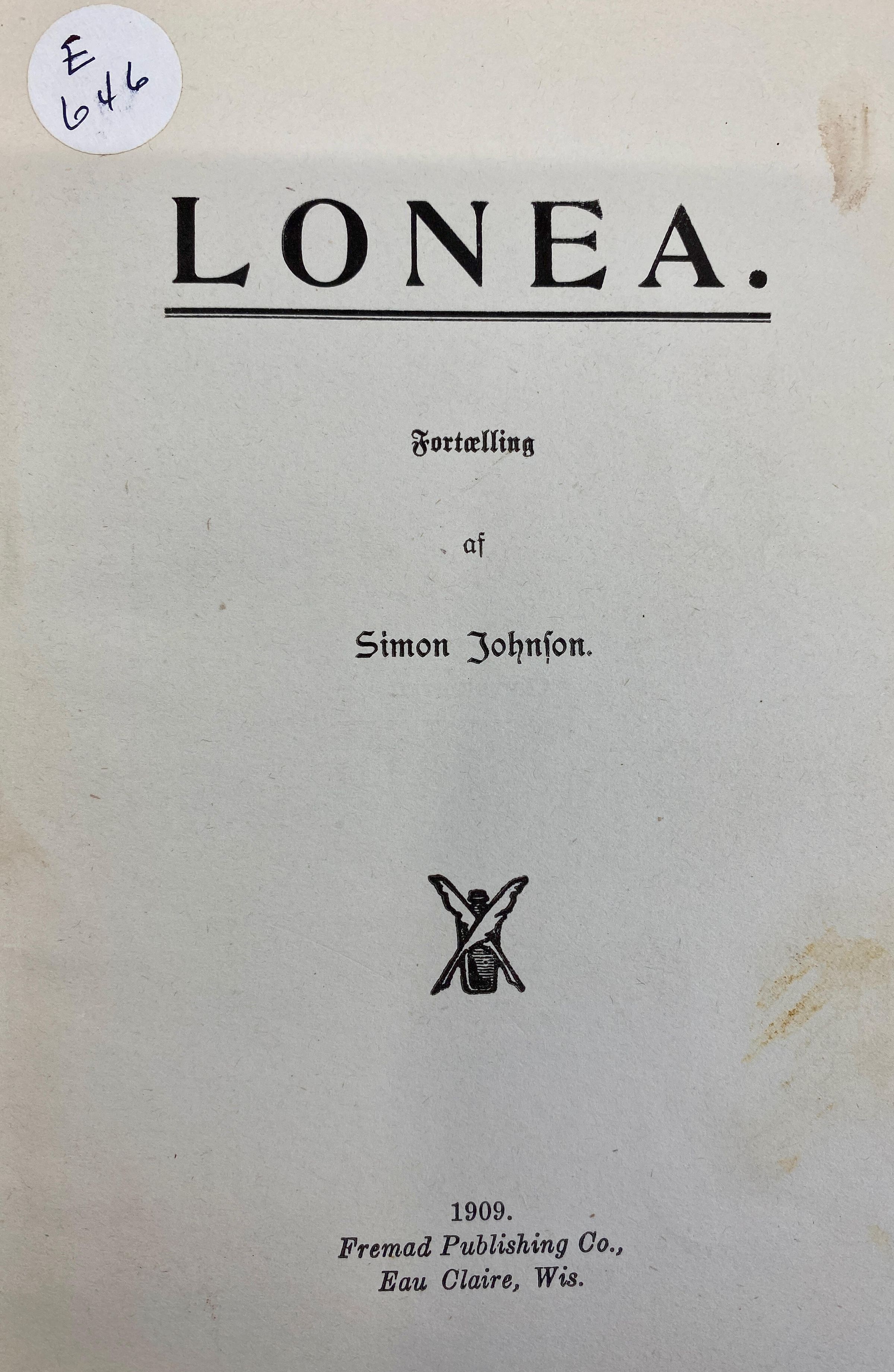 Lonea by Simon Johnson, published in 1909 by Fremad PUblishing Company, Eau Claire, Wisconsin.Cataloged By