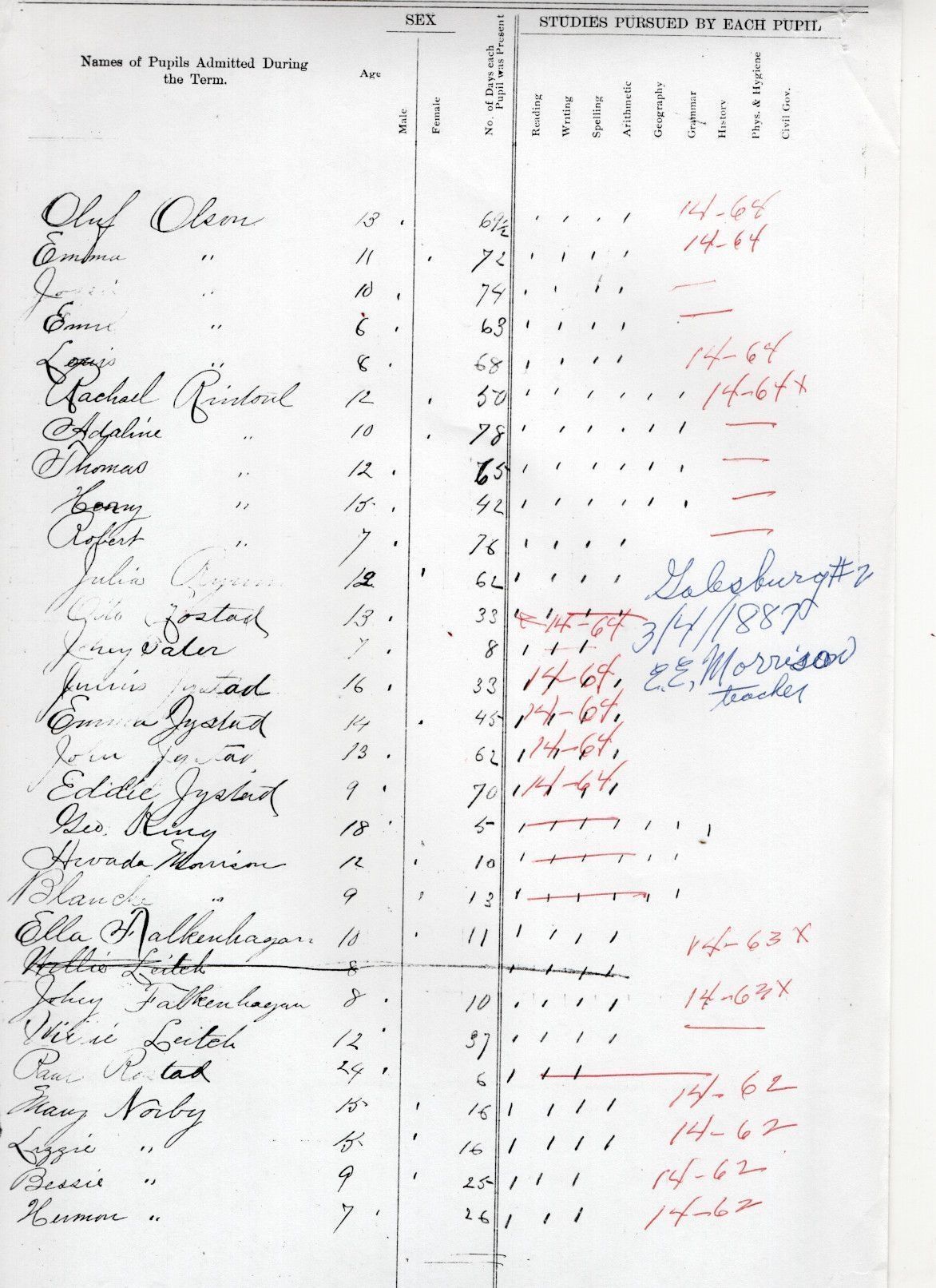 0n 4 March 1887, Galesburg School No. 2 teacher E. E. Morrison reported attendances and studies pursued for 28 students: Johny Eater, Ella Falkenhagen, John Falkenhagen, Eddie Jystad, Emma Jystad, John Jystad, Julius Jystad, George King, Minnie Leitch, Blanche Morrison, Hevada Morrison, Bessie Norby, Herman Norby, Lizzie Norby, Mary Norby, Emil Olson, Emma Olson, Jossie Olson, Louis Olson, Oluf Olson, Adeline Rintoul, Harry Rintoul, Rachel Rintoul, Robert Rintoul, and Thomas Rintoul, Otto Rostad, Paul Rostad, and Julia Ryan.