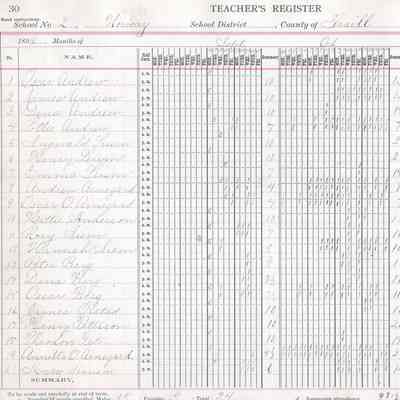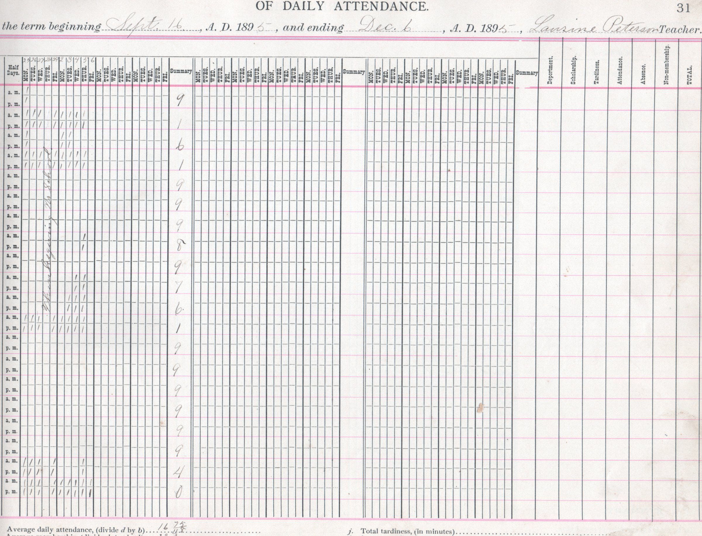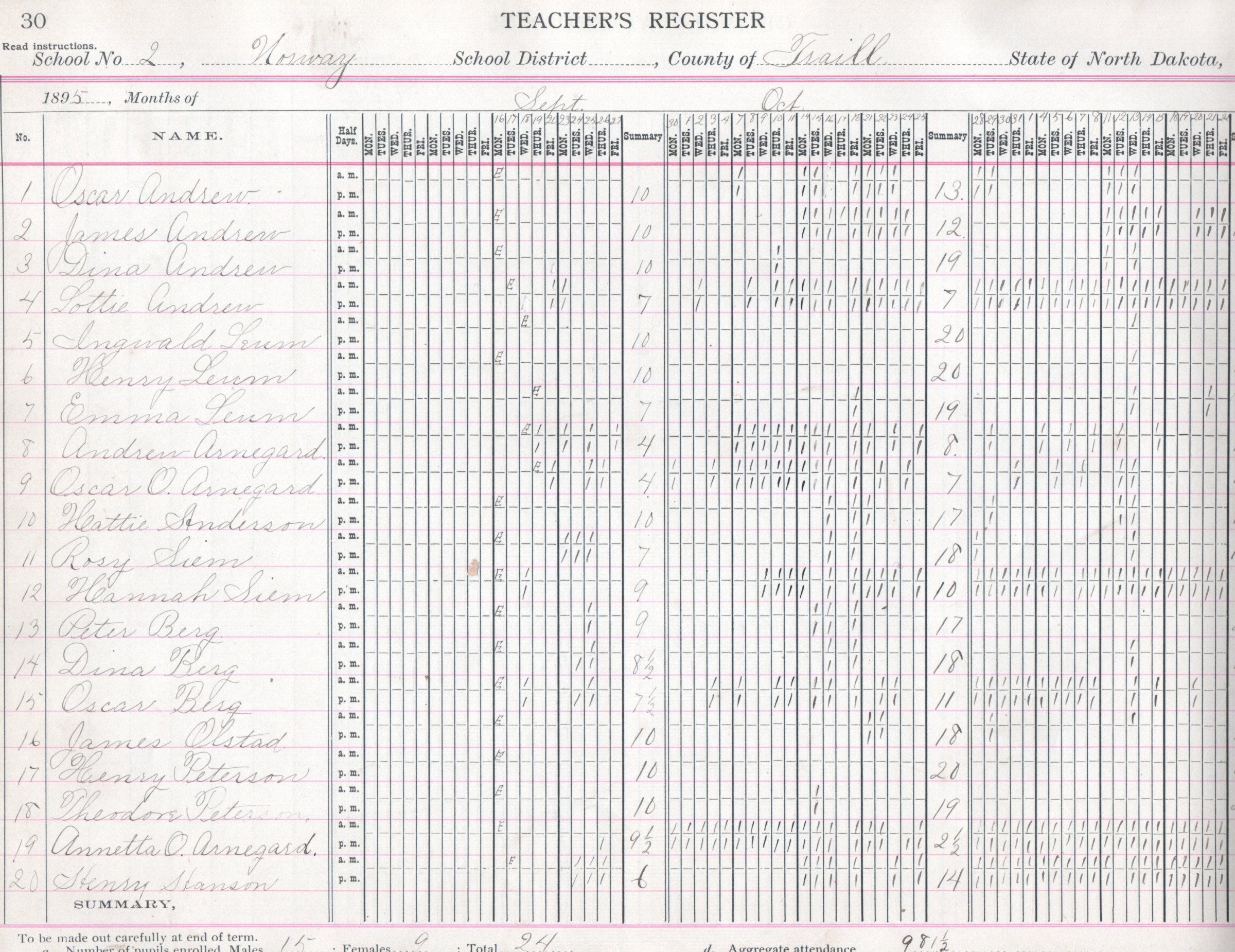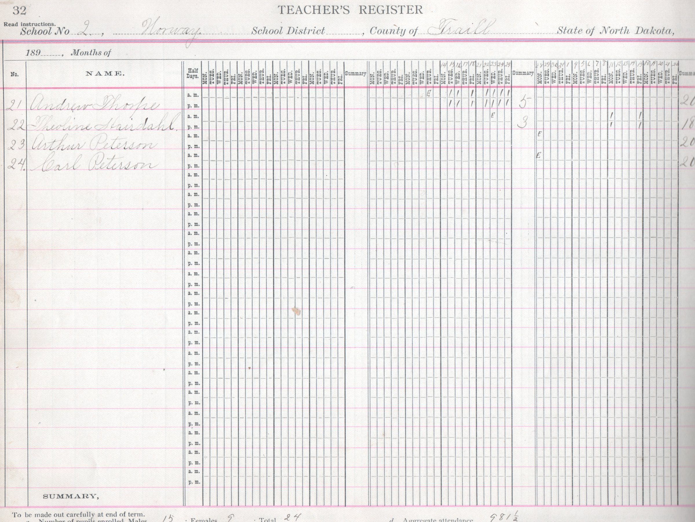 On her Register pages for April to July, Laurine Petersen kept attendance records for 24 students: Hattie Anderson, Dina Andrew, James Andrew, Lottie Andrew, Oscar Andrew, Andrew Arnegard, Annetta Arnegard, Oscar Arnegard, Dina Berg, Oscar Berg, Peter Berg, Henry Hanson, Theoline Hairdahl, Emma Leum, Henry Leum, Ingwald Leum, James Olstad, Arthur Peterson, Carl Peterson, Henry Peterson, Theodor Peterson, Hannah Siem, Rosy Siem, and Andrew Thorpe.