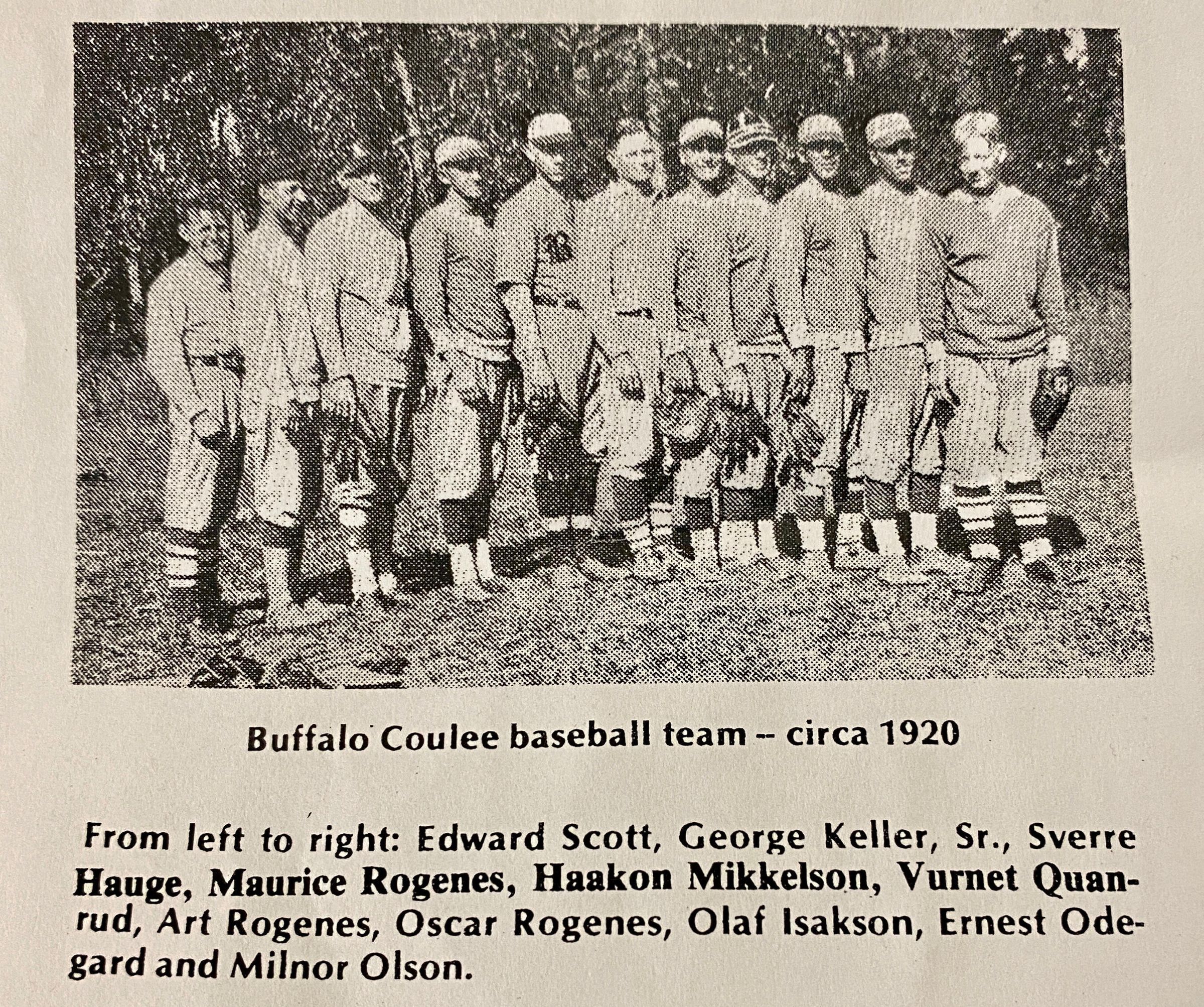 Their first baseball diamond was located near the Nomland Grove (across the road from the Hovet School). Later their playing field was moved to the bank of the Buffalo Coulee across from the L. C. Odegard Farm.