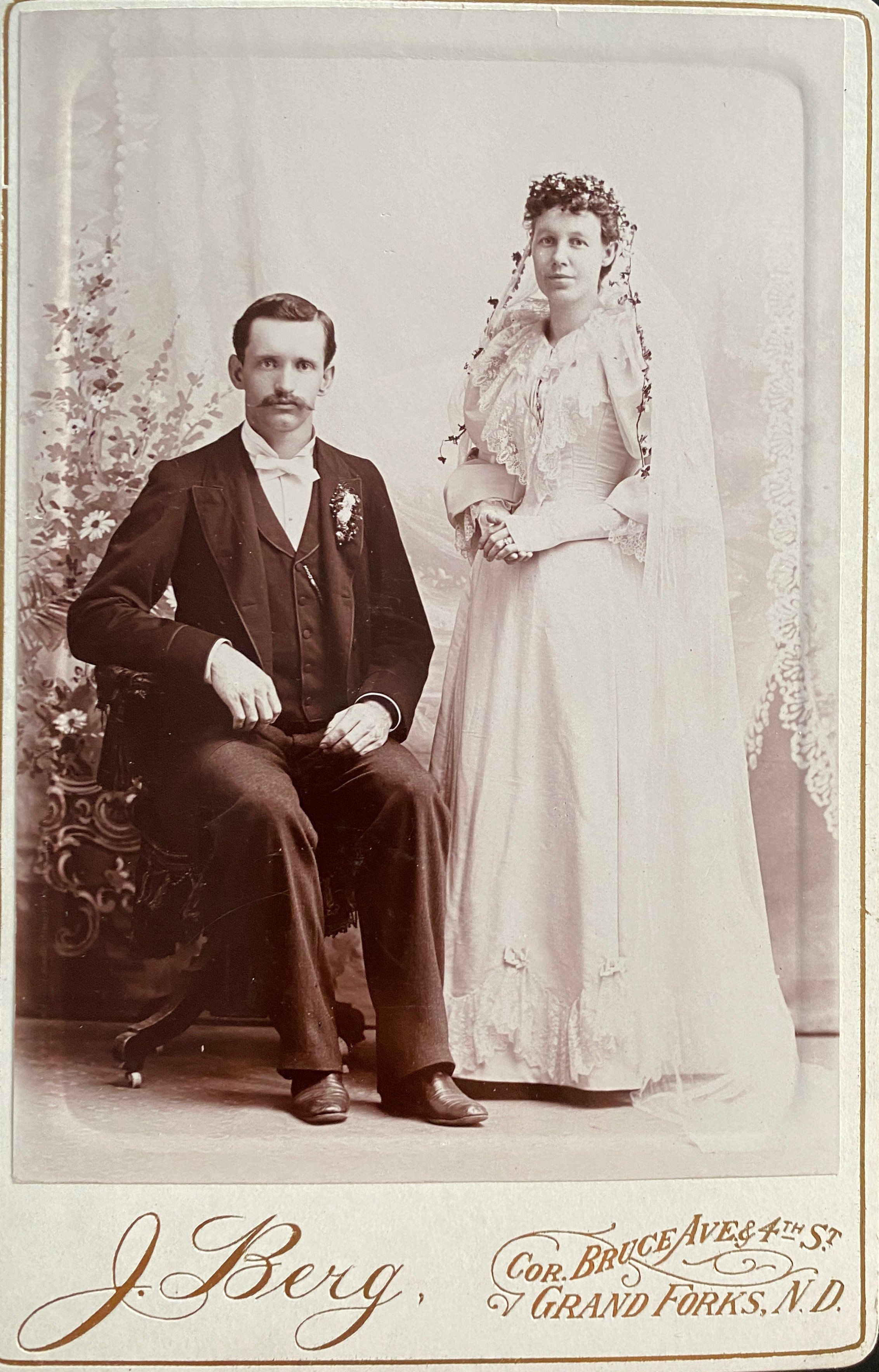 The first photograph at left is very likely a wedding photo of Jens Figenskau and Louisa Grimsrud. Louisa (or Louise) was born in July 1867 in Coon Valley, Vernon County, WI, to parents John L. and Kari (Aronsveen) Grimsrud (photo, below), who farmed near Colfax, WI [1880 US Census].