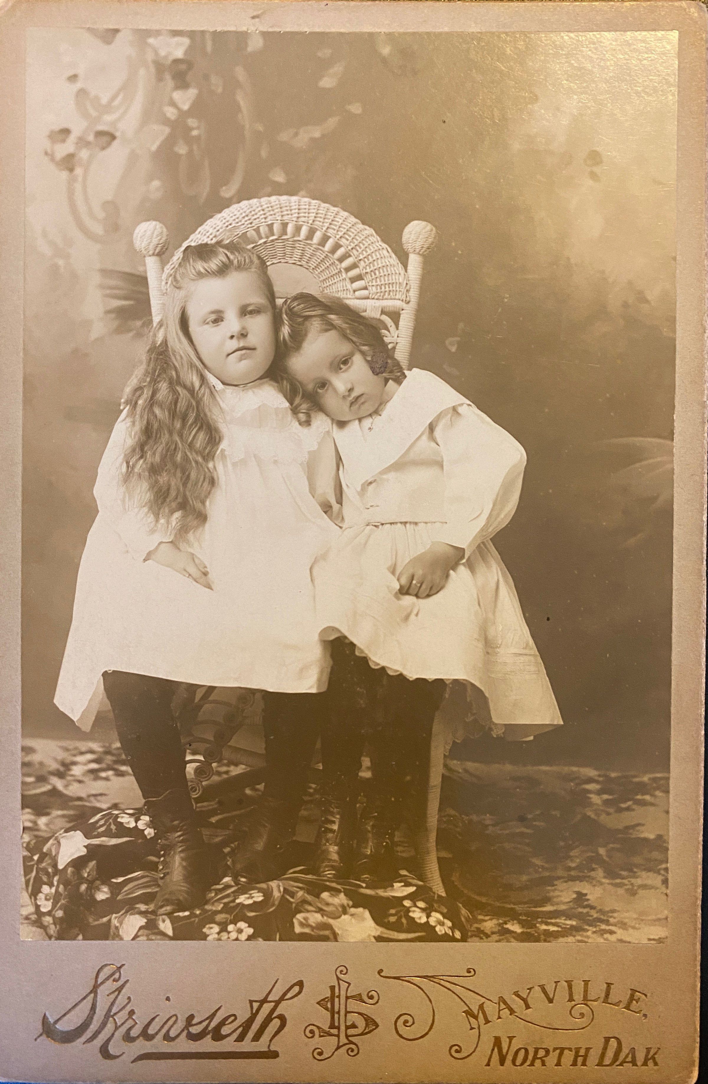 A photograph of Louisa (Grimsrud) Figenskau with her daughter Alpha Lorinda Figenskau was taken at A. P. Holland Studio of Grand Forks in about 1898 (below). Another photograph of Alpha Figenskau (below, smaller girl at right) was taken in about 1900 at the Skrivseth Studio in Mayville, ND. The older girl at right is unknown. Sadly, Alpha Figenskau passed away at the age of only 5 on 18 October 1901. Alpha Figenskau was interred in Memorial Park Cemetery in Grand Forks.