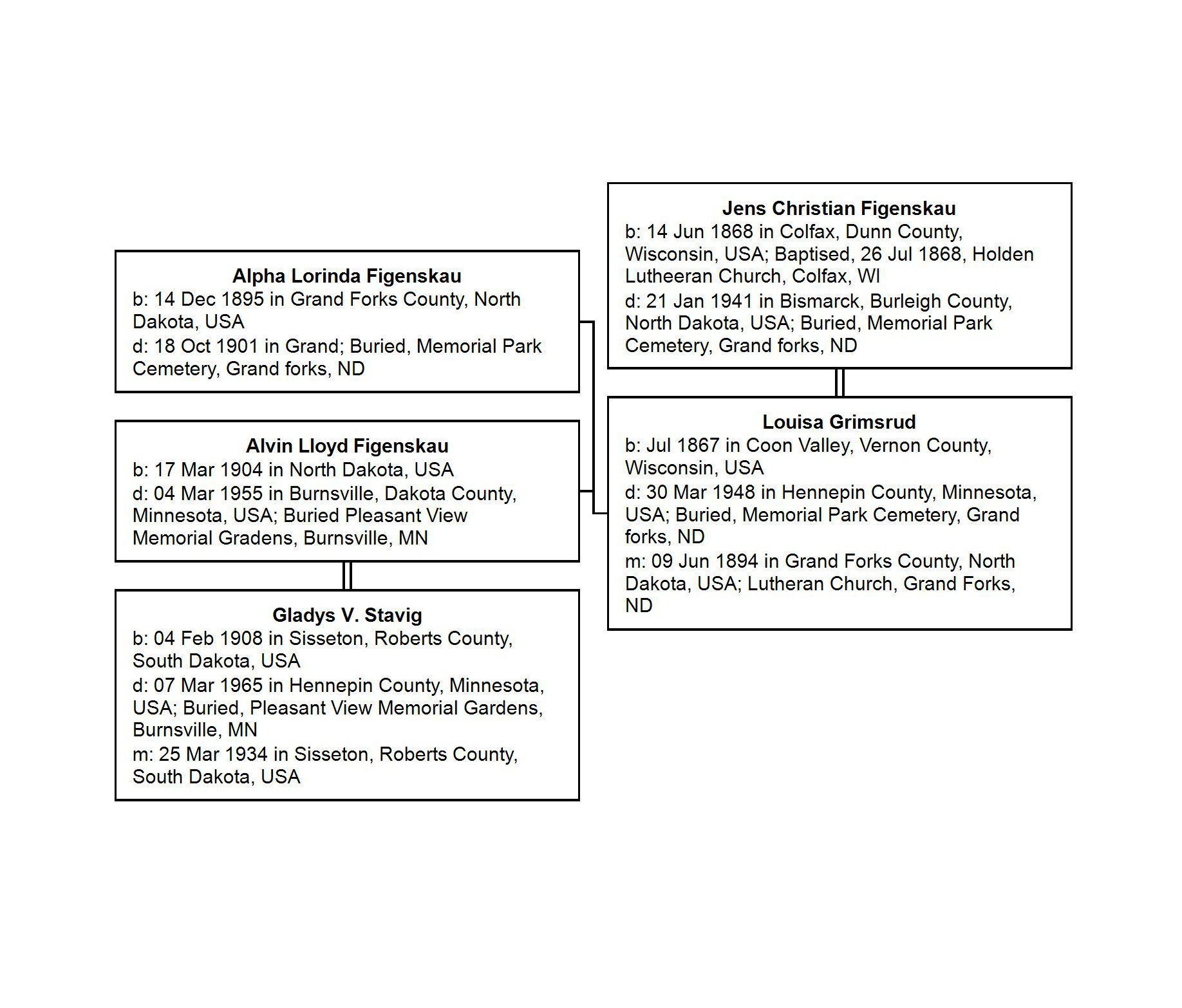 Jens and Louisa Figenskau's son, Alvin Lloyd, was born on 17 Mar 1904 in Grand Forks, ND, where his father was employed as a "Collector" [1900 US Census]. By 1910, Alvin Lloyd, age 6, had moved with his parents to Oslo in Marshall County, MN, where his father now worked as a "Banker" in a "Bank" [US 1910 Census]. Ag age 16, Alvin Lloyd Figenskau continued to reside with his parents in Oslo where his father continued to be employed as a "Cashier" in a "Bank" [1920 US Census]. At age 30, Alvin Lloyd Figenskau married Gladys V. Stavig in Sisseton, SD. Alvin Lloyd and Gladys resided in Burnsville by Minneapolis, and had two children, son Robert and daughter Terry Figenskau. At age 50, Alvin Lloyd Figenskau passed away on 4 March 1955 in Burnsville, and was buried in the local Pleasant View Memorial Gardens [US Find-a-grave info]. At age 57, Gladys (Stavig) Figenskau died on 7 March 1965, and was buried next to Alvin Lloyd in Burnsville's Pleasant View Memorial Gardens.