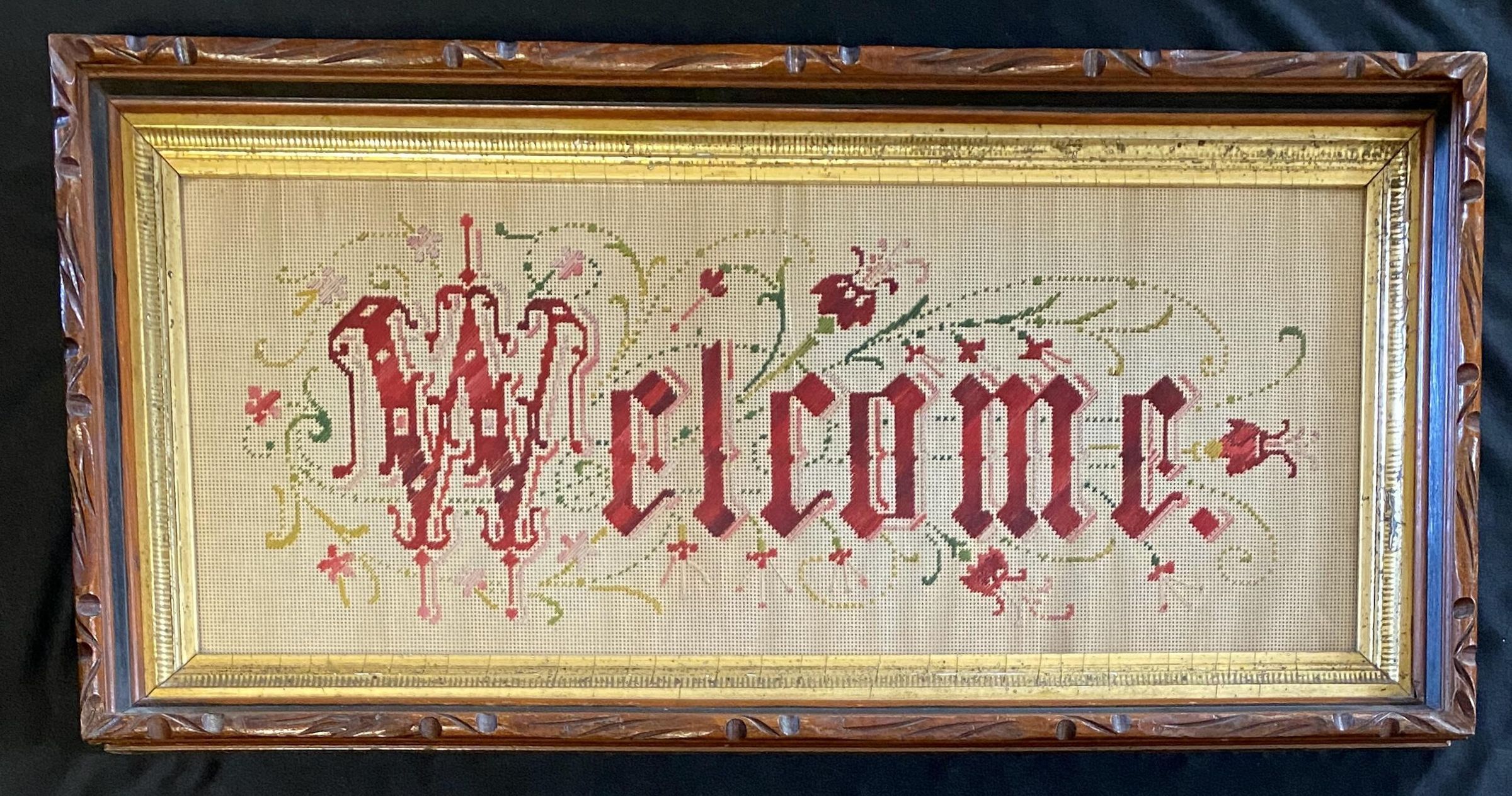 Late 1800's Hand Stitched Sampler - "Welcome". Previously was hung in the home of Lewis Howard.Cataloged By