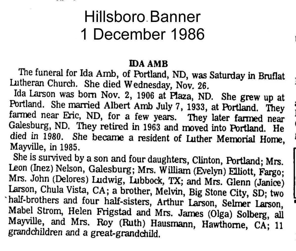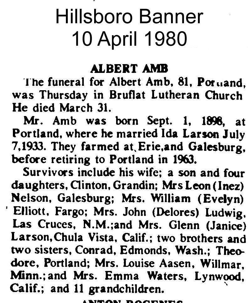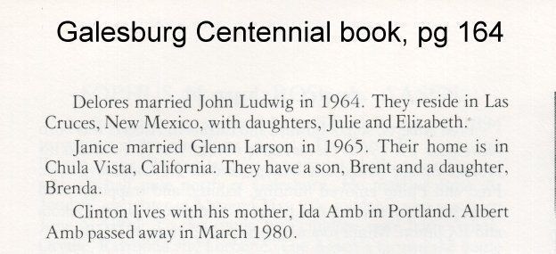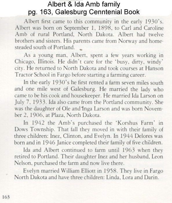 On 7 July 1933, Albert Amb married Ida Larson, who was born 2 November 1906 to parents Ole and Inga Larson of Portland, ND. As described on pages 163 and 164 in the Galesburg Centennial book, Albert and Ida Amb had one son, Clinton Amb, and four daughters, Inez (Amb) Nelson, Evelyn (Amb) Elliott, Delores (Amb) Ludwig, and Jance (Amb) Larson.