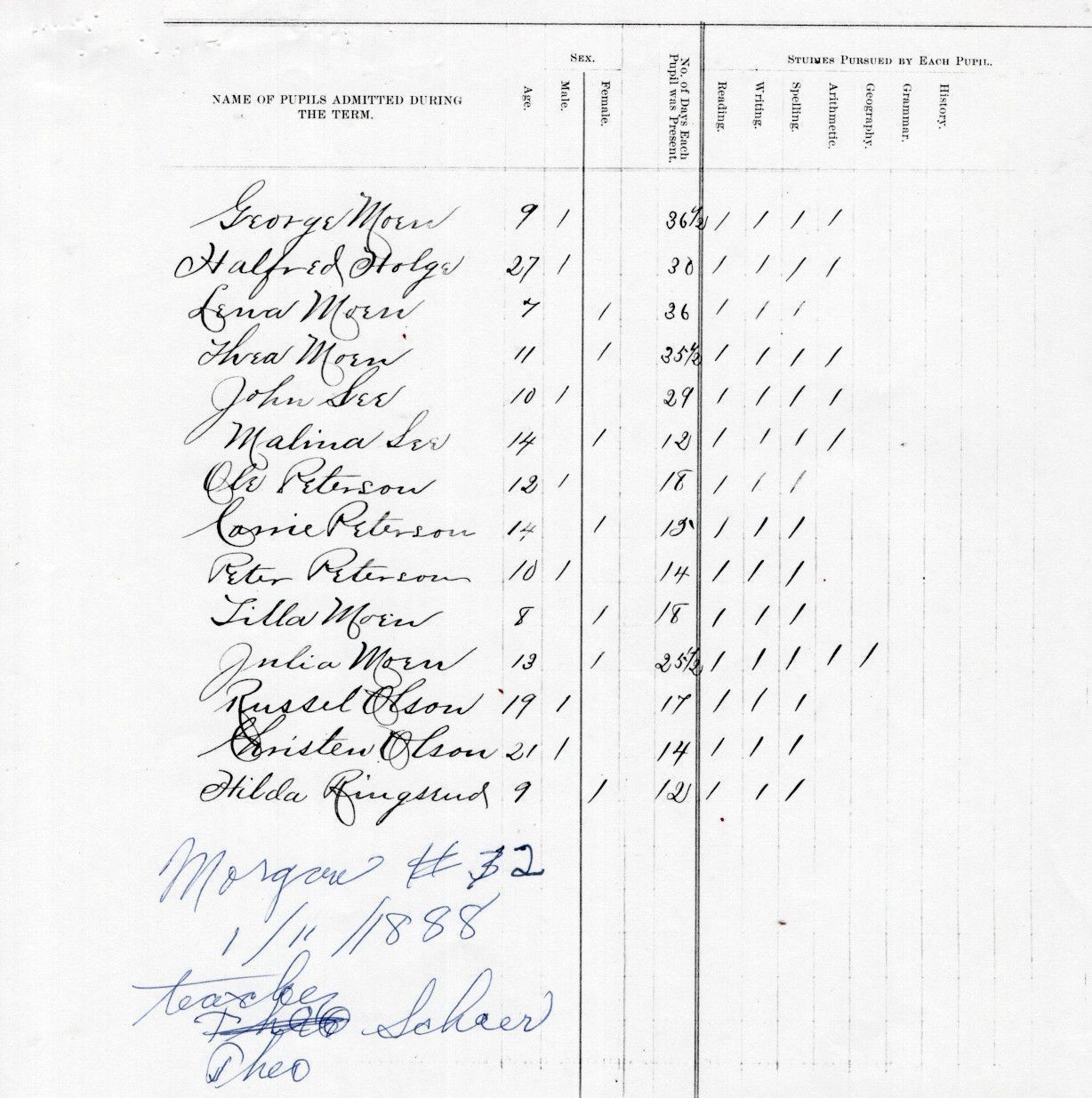 On 11 January 1888, Morgan School No. 2 teacher, Theo Schaer, reported the attendance of 14 students: Halfred Holge, John Lee, Malina Lee, George Moen, Julia Moen, Lena Moen, Thea Moen, Tilla Moen, Christen Olson, Russel Olson, Connie Peterson, Ole Peterson, Peter Peterson, and Hilda Ringsrud.