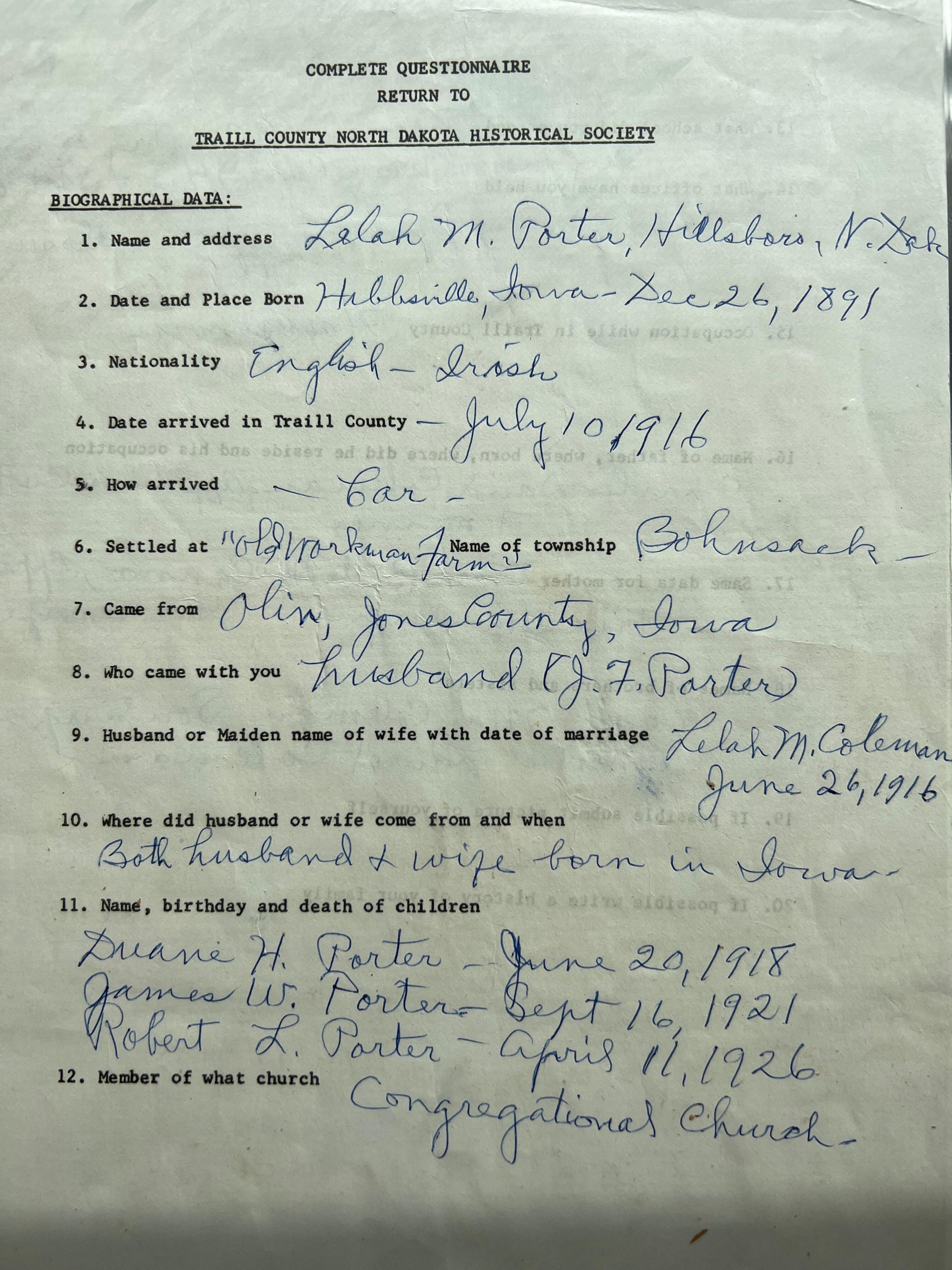 A two-page completed questionnaire on the life of Lelah Coleman, who was born in 1891 in Iowa and who married and settled with her husband, James F. Porter, in 1916 in Bohnsack Township, Traill County, ND. James and Lelah had three boys, including Duane H. Porter (born 20 June 1918), James W. Porter (b. 16 September 1921), and Robert L. Porter (b. 11 April 1926).Cataloged By