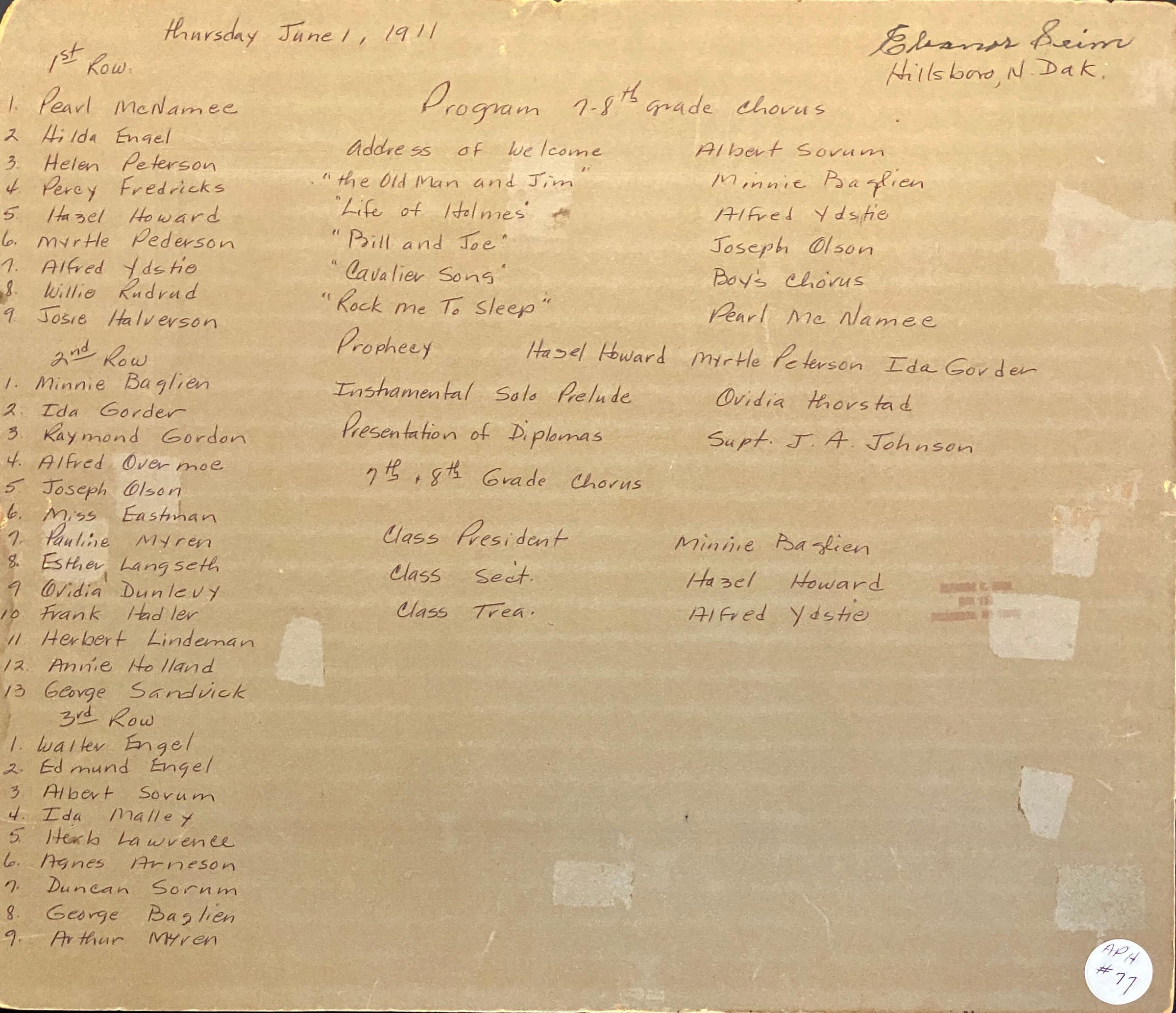Alfred Overmoe, Raymond Gordon, Walter Engel, Hazel Howard, Annie Holland, Edmund Engel, Esther Langseth, Frank Hadler, Alfred Ydstie, Helen Peterson, Ovidia Dunlevy, Herbert Lindeman, Albert Sorum, Ida Malley, Pauline Myron, Willie Rudrud, Herb Lawrence, George Baglien, Duncan Sorum, Minnie Baglien Bahnsen, Ida Gorder, Arthur Myron, Pearl McNamee, Percy Fredricks, Hilda Engel, George Sandvick, Agnes Arneson, Josie Halverson, Joseph Olson, Miss Eastmann, Myrtle PedersonSubject Place
