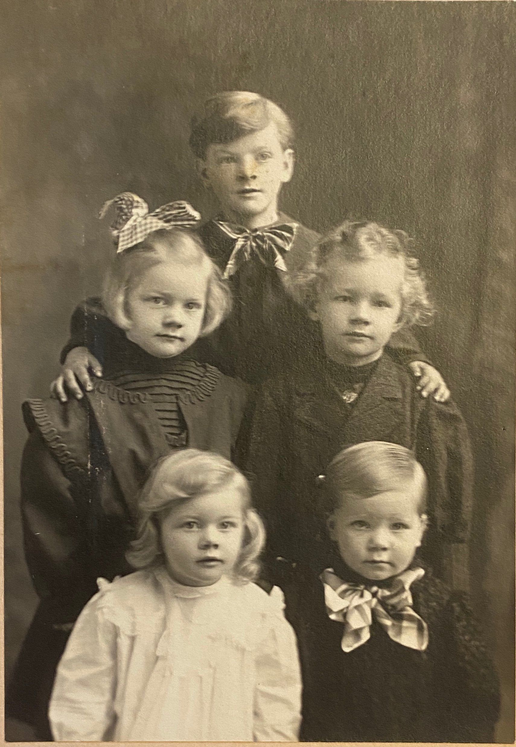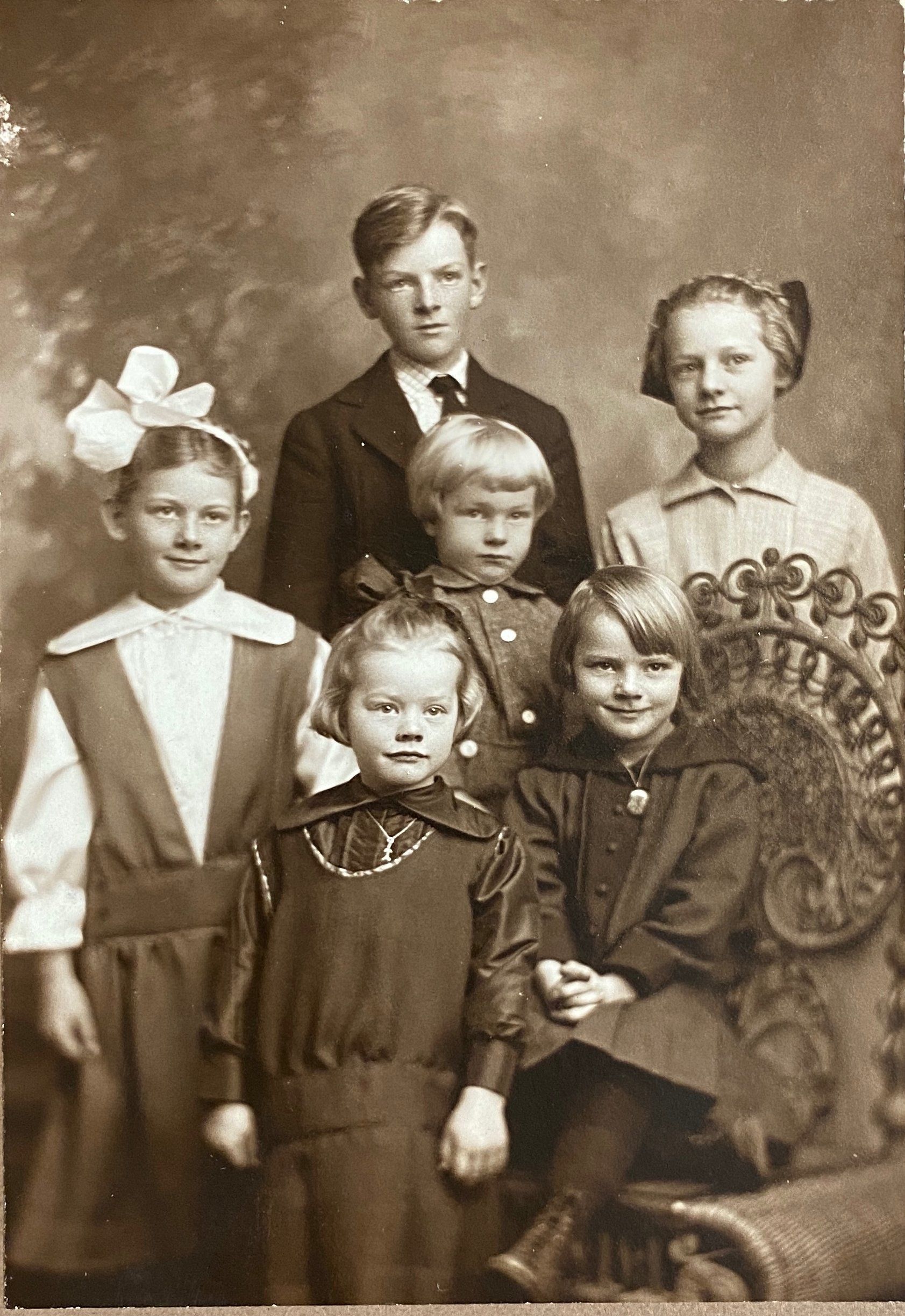 On 19 August 1902, Mathias O. (Mat) Halvorson, age 38, married Clara Josephine Jordahl, age 28, in Lake Park in Becker County, MN, at the Lake Park Lutheran Church [US ELCA Marriage Record]. Clara Jordahl was born on 20 February 1875 in Lake Park to parents Peter and Elizabeth (Hanson) Jordahl. Clara was raised and schooled in Lake Park, but as noted above, by the age of 25 Clara Jordahl had moved to Buxton, ND, where she owned and operated a hotel [1900 US Census]. After Clara and Mat married in 1902, they continued to live and work in Buxton, where they raised six children, Owen, Inez, Mildred, Hortence, Sylvia, and Roald Halvorson [family tree, below; 1910 & 1920 US Census data]. Their six children are shown in a family photo (below), which was taken in about 1915 at Fuller Studio in Hillsboro, ND. Another Fuller photograph, taken a bit earlier in about 1910, shows Mat and Clara's three oldest children, Owen (born 18 Jan 1903), Inez (b. 1 Mar 1904), and Mildred (b. 4 Mar 1906) with their first cousins, Kenneth Olson (b. 2 Mar. 1904) and Irvin Olson (b. 28 Apr. 1906); these are the two oldest children of Ole K. and Ostina (Halvorson) Olson. The five children in this photograph are grandchildren of Halvor 'Ole' & Ingeborg (Rognstad) Halvorson.