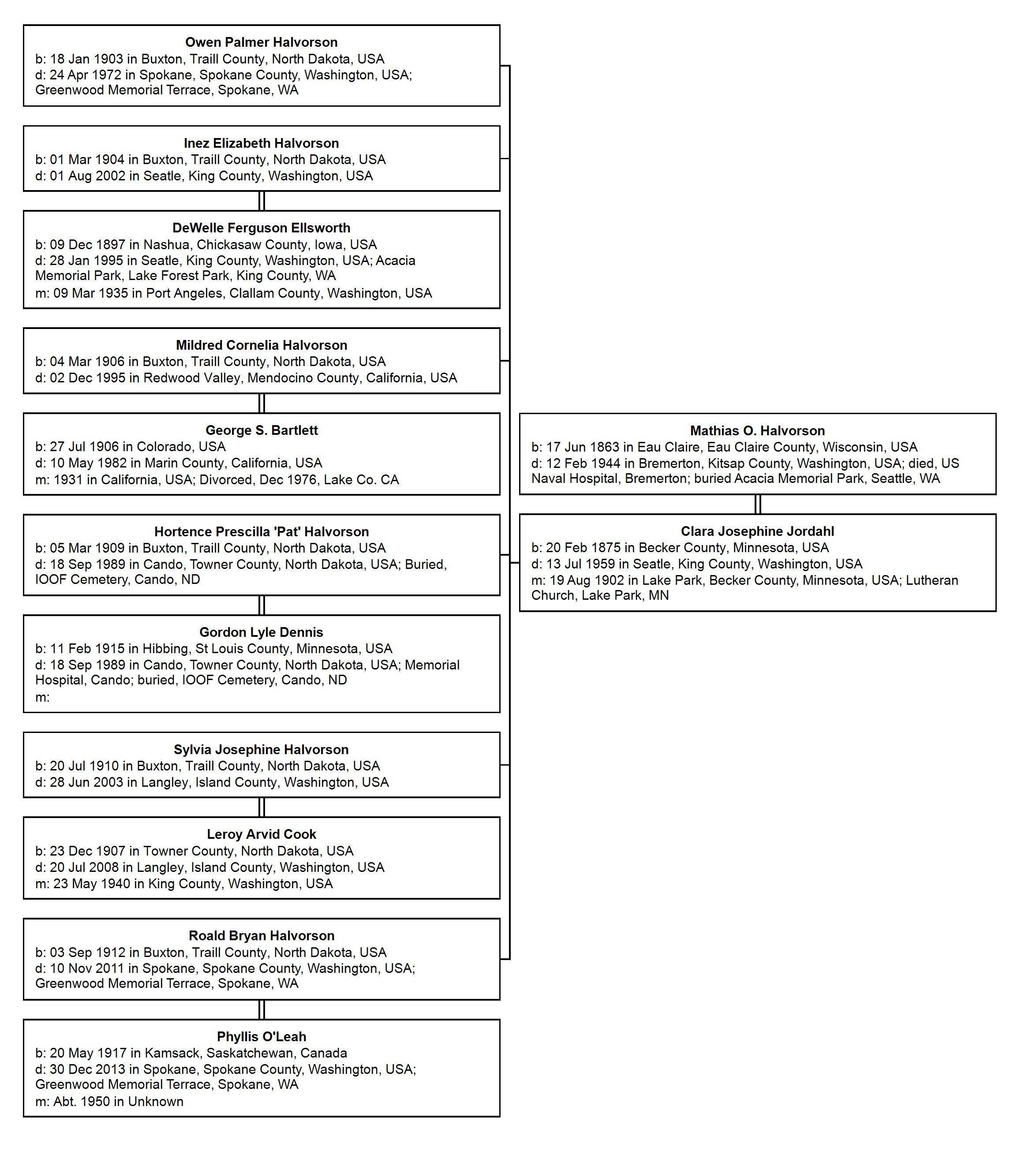 After her husband Mat died in 1944, Clara moved to Seattle to live with her daughter Sylvia (Mrs. Leroy A. Cook) and family [1950 US Census]. Clara J. (Jordahl) Halvorson lived to the age of 84, passing away on 13 July 1959 at the L.C. Foss Sunset Home on Greenwood Ave in Seattle [WA Death Certif.]. At the time of her passing, Clara was being cared for by her daughter, Sylvia, who lived with her family on 1st Ave NE in Seattle. Clara (Jordahl) Halvorson was interred at Acacia Memorial Park in Lake Forest Park, King County, WA [US FaG grave-marker, below].Acquisition