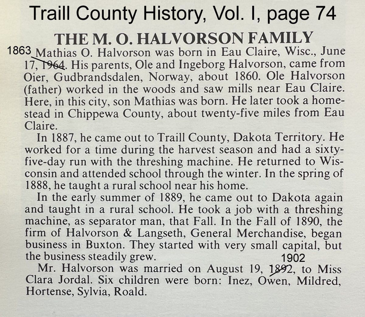 As written on page 74 in the 1875-1975 Centennial book, Traill County History "Yesteryears", Vol. I (below), Mathias O. "Mat' Halvorson was born in Eau Claire, Wisconsin, on 17 June 1863. His parent's, Ole and Ingeborg (Rognstad) Halvorson had come to Eau Claire from Norway in about 1860. His father, Ole, first worked in the timber industry around Eau Claire, but then homesteaded land 25 miles north of Eau Claire in Chippewa County.