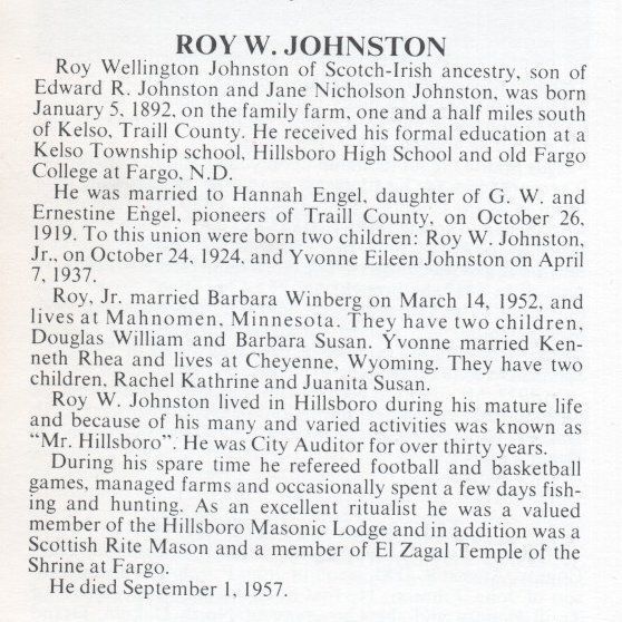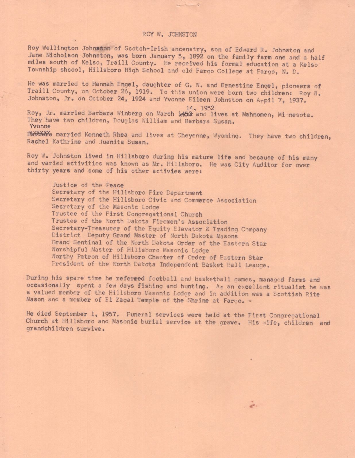 This family history folder contains a brief article on the live of Roy W. Johnston published on page 100 in the book, Traill County History, Vol. I. Roy W. Johnston was born on 5 January 1892 to parents Ed. R. and Jane (Nicholson) Johnston's on the family farm located 1.5 miles south of Kelso, ND. Roy attended a rural Kelso Township school, Hillsboro High School and a college in Fargo.