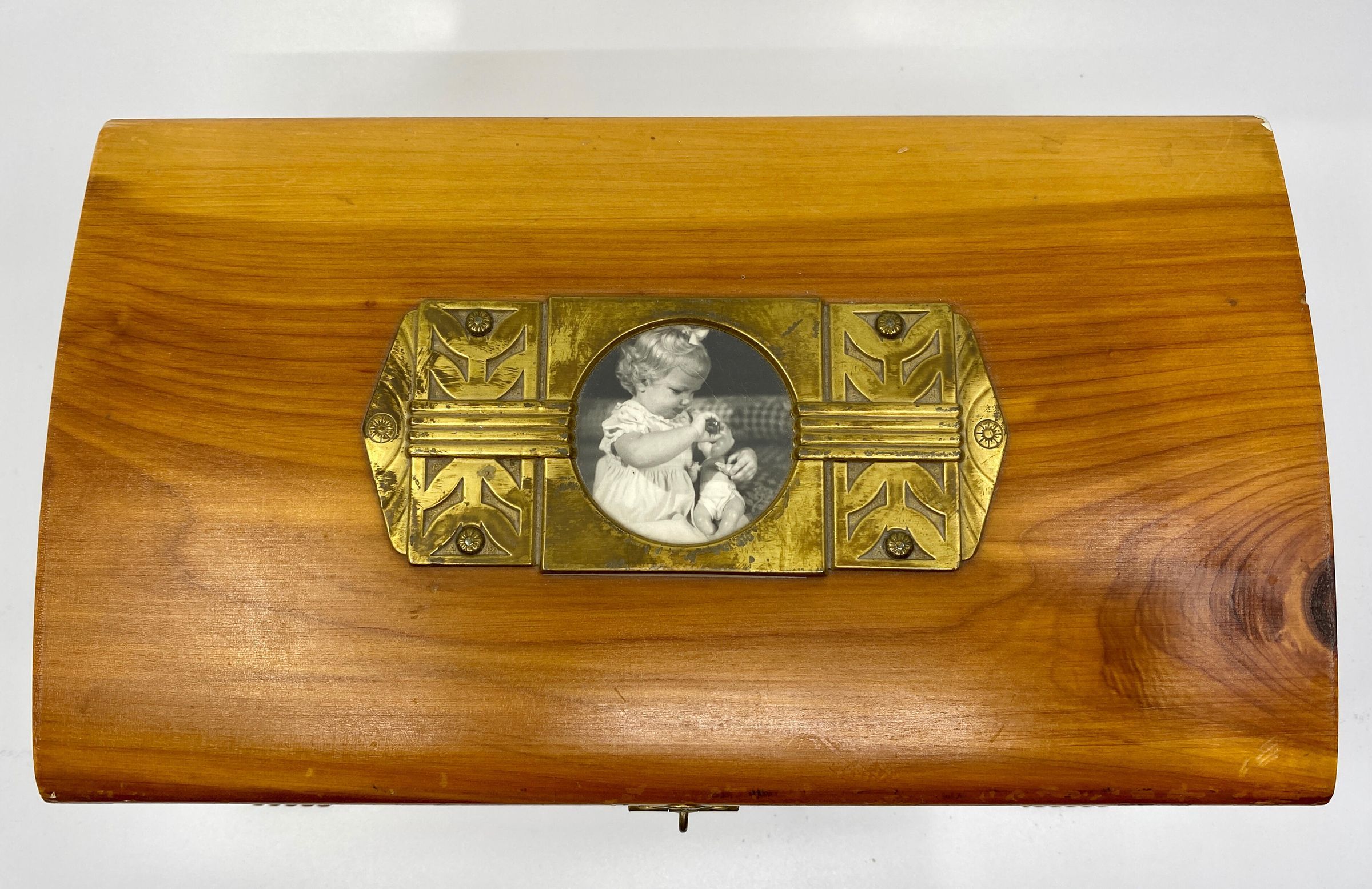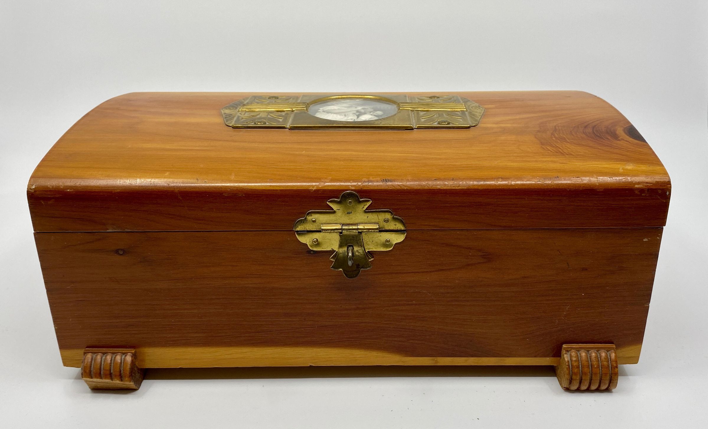 Small Cedar Chest with brass plate on cover with a black and white picture of a little girl bottle feeding her doll.