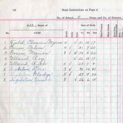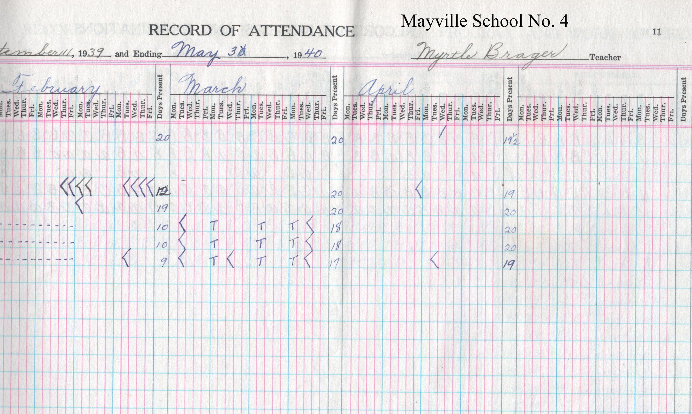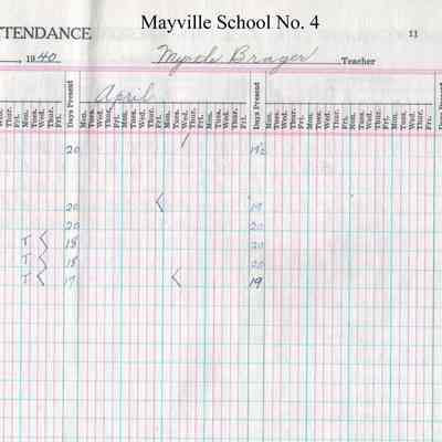 During the 1939-1940 school year, Mayville School No. 4 teacher, Myrtle Brager, kept attendance records for 8 students including Clarence Fjeld, Arlene Gorum, Marion Gorum, Doris Ingebretson, Gladys Ingebretson, Kenneth Ingebretson, Roy Ulland, and Ruth Ulland.Acquisition