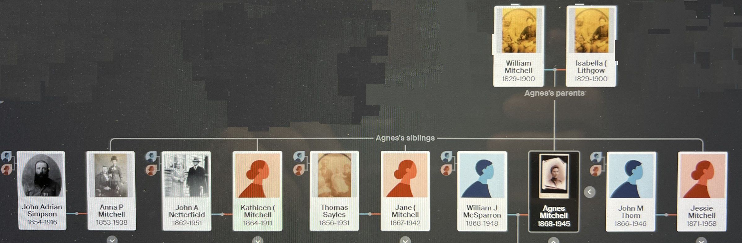 This family history folder includes a photograph of three Mitchell sisters, Jean, Agnes and Jessie. An Ancestry.com family tree documents the year of birth of the three sisters as:
