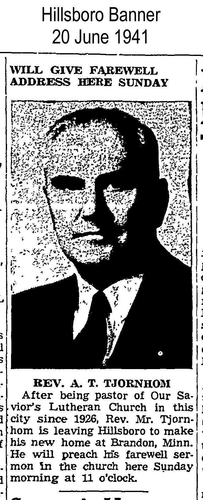 Rev. A. T. Tjornhom served as pastor of Our Savior's Lutheran Church in Hillsboro, ND, from 1926 to 1941, before moving to Brandon, MN.Cataloged By