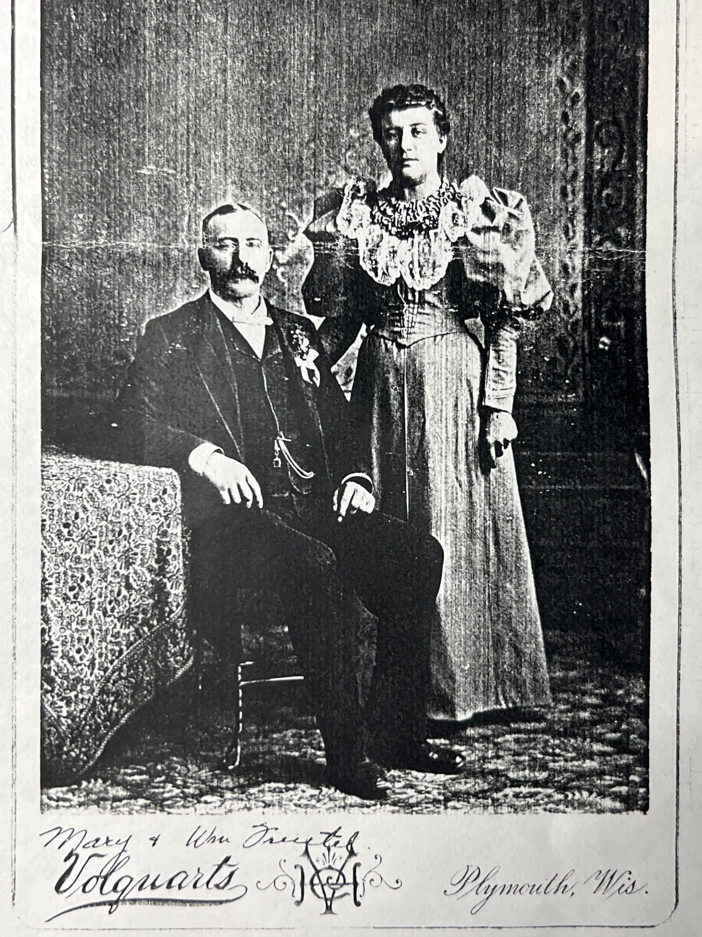 This Volquarts Studio photograph of the wedding couple, Mary Bohnsack and William Freutel, was taken in Plymouth, Wisconsin. Mary Bohnsack was the daughter of John and Maria (Heineke) Bohnsack and a sister to Friedericka (Bohnsack) Hausmann, Sophia (Bohnsack) Miller, Charles Bohnsack, Phillip Bohnsack and William Bohnsack. Mary was first married to Herman Lindeman, but after he died in 1883, she married William Freutel, who was born in June 1855.Acquisition