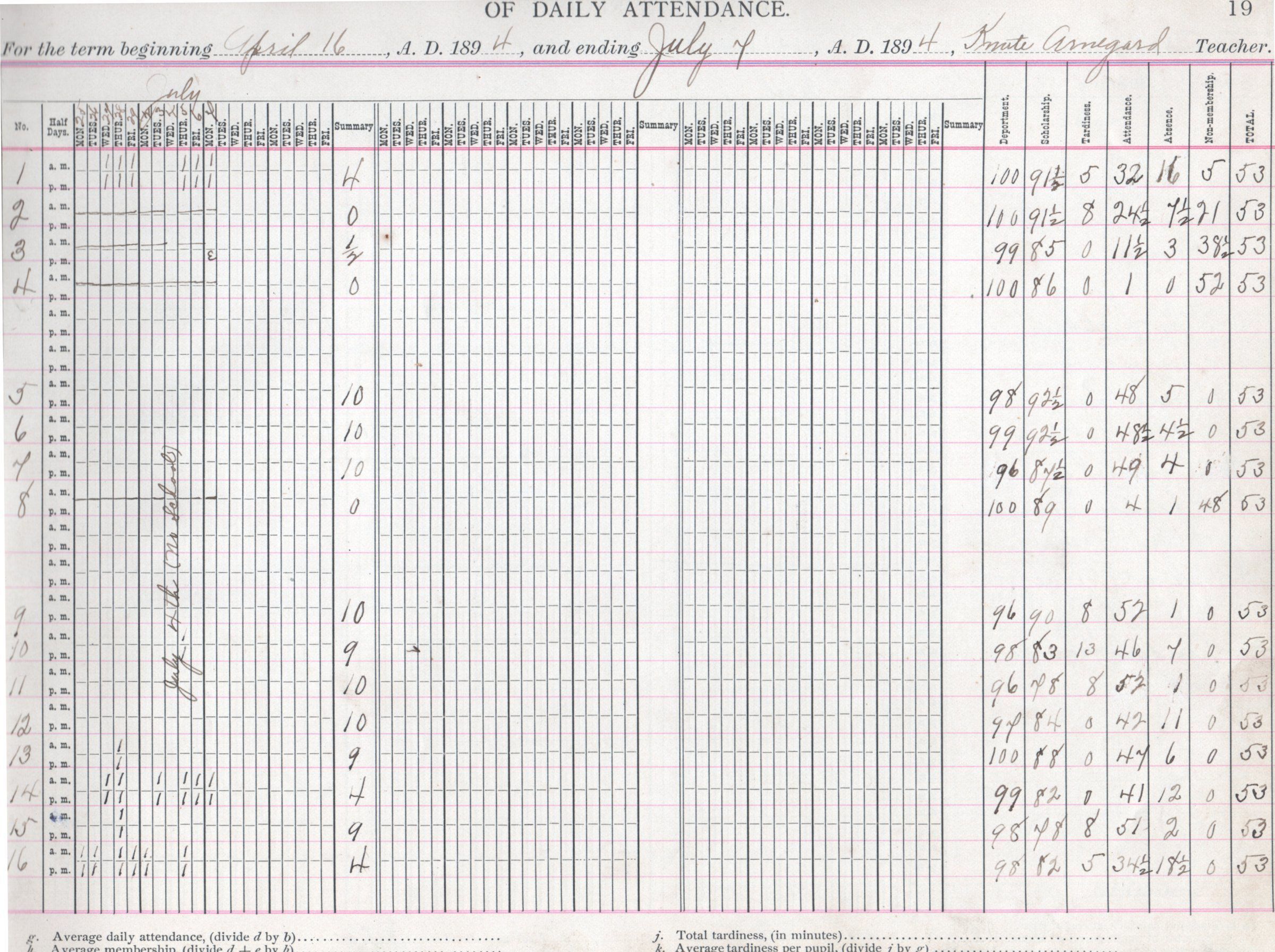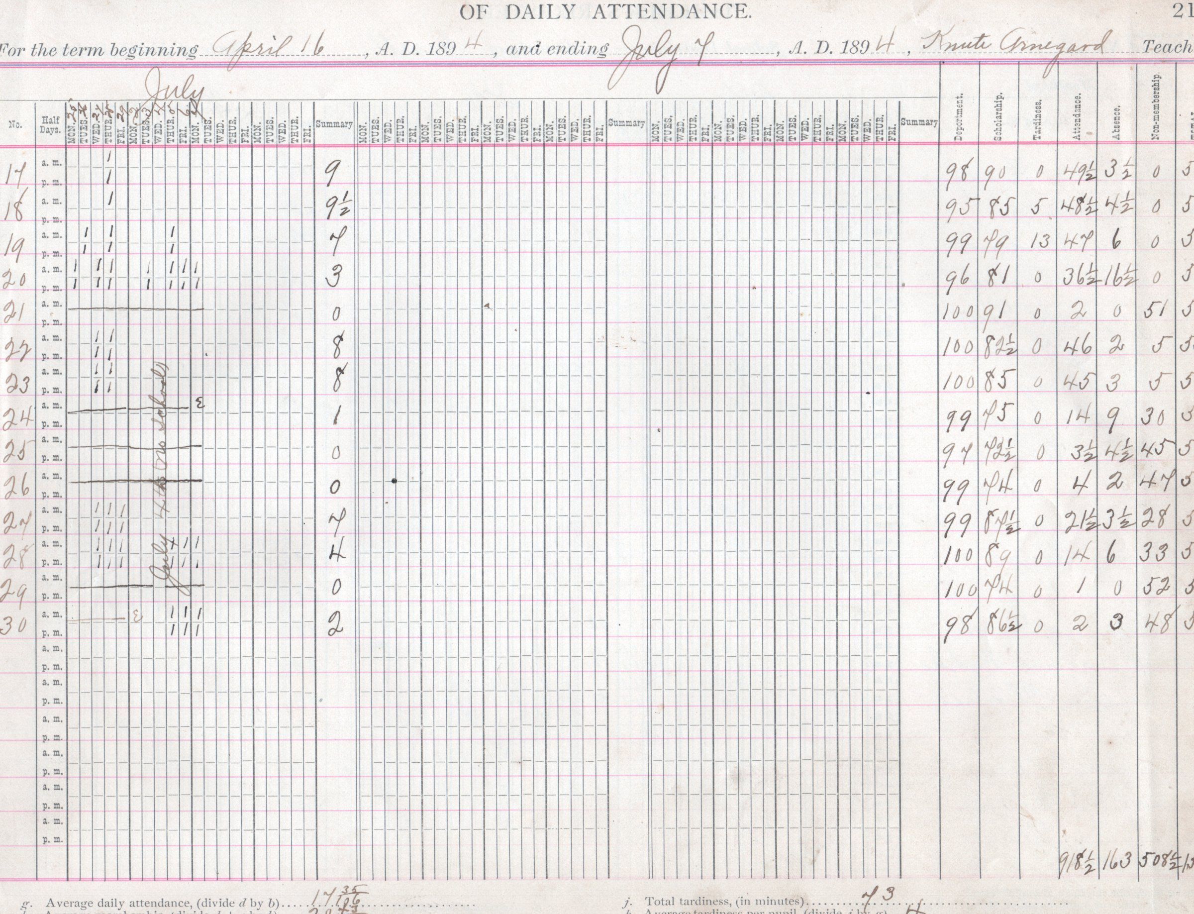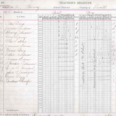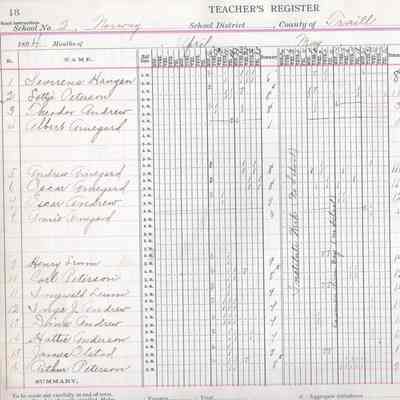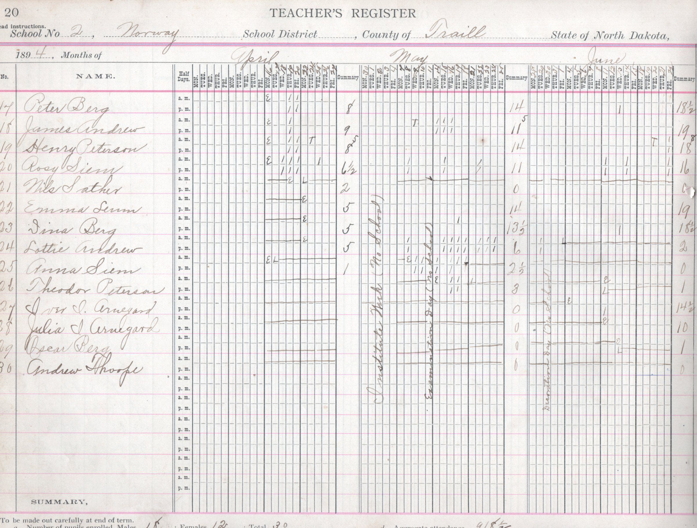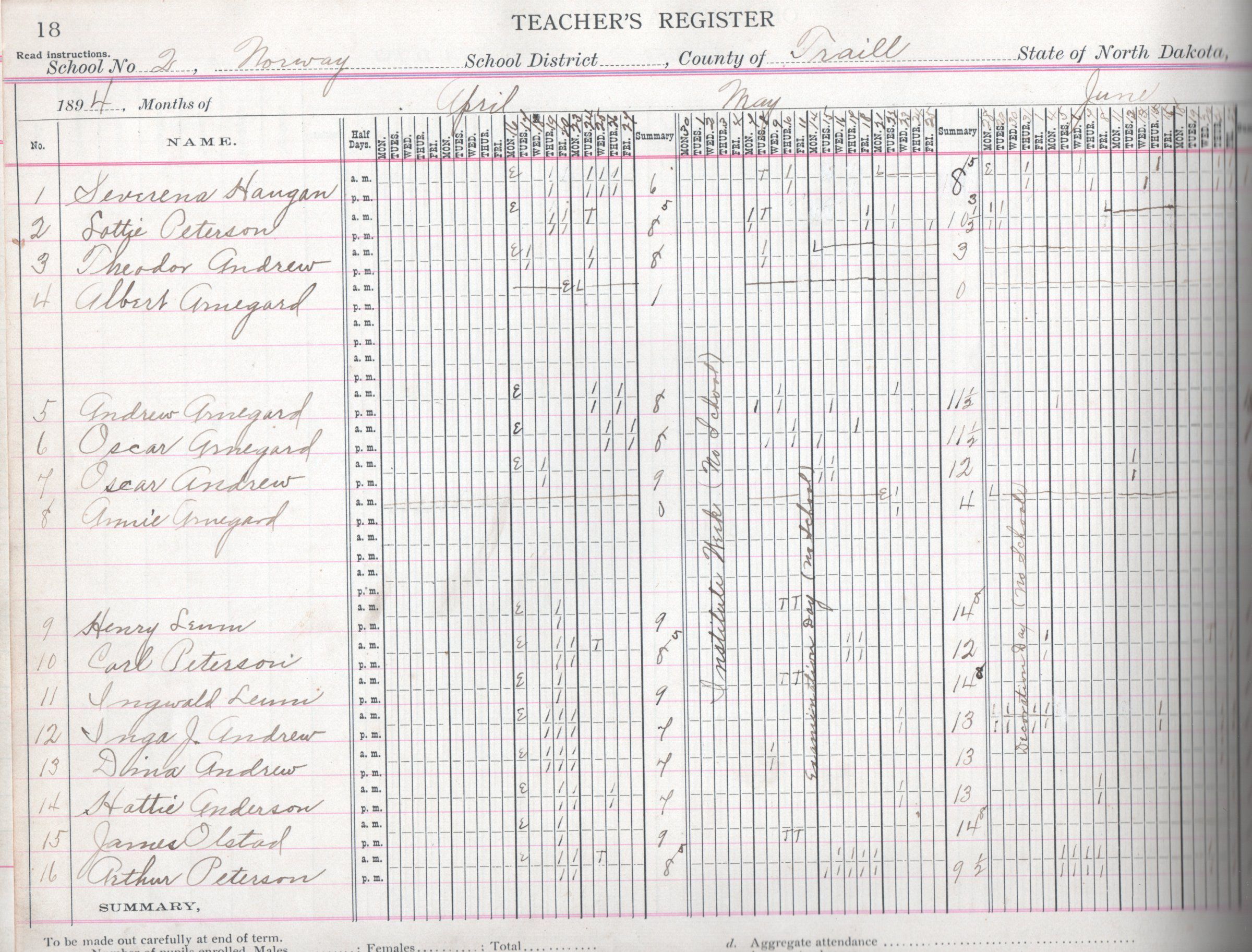 In 1894, the Norway No. 2 teacher was Knute Arnegard. On his Register pages for April, May, June and July, Knute Arnegard kept attendance records for 30 students: Dina Andrew, Hattie Andrew, Inga Andrew, James Andrew, Lottie Andrew, Oscar Andrew, Theodor Andrew, Albert Arnegard, Annie Arnegard, Andrew Arnegard, Iver Arnegard, Julia Arnegard, Oscar Arnegard, Dina Berg, Oscar Berg, Peter Berg, Severena Haugen, Emma Leum, Henry Leum, Ingwald Leum, James Olstad, Arthur Peterson, Carl Peterson, Henry Peterson, Lottie Peterson, Theodor Peterson, Nils Sather, Anna Siem, Rosie Siem, and Andrew Thoope.