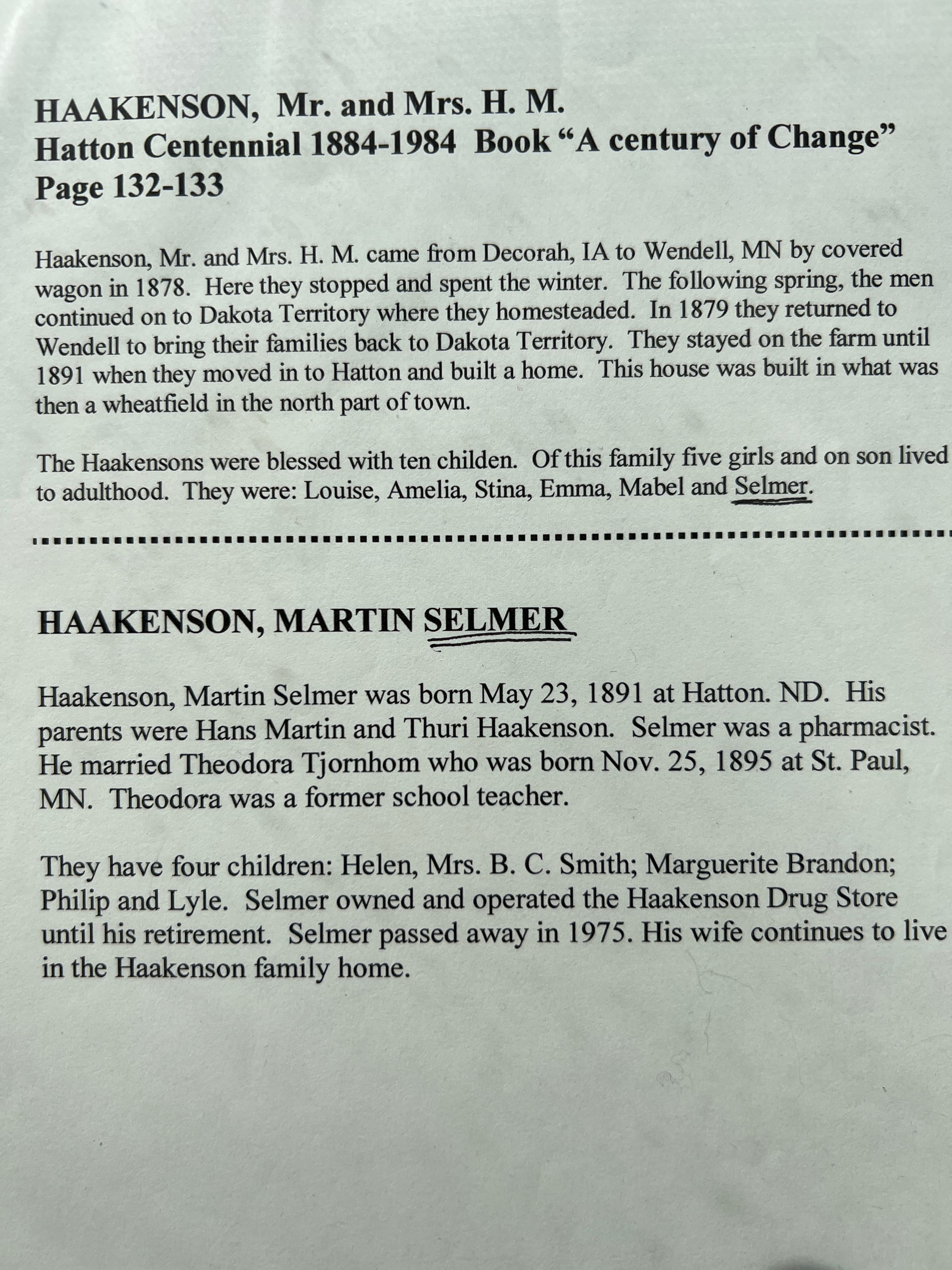A file with excerpts from the Hatton Centennial 1884 - 1984 book "A Century of Change" for pages 132-133 about the Hans Martin and Thuri Haakenson family, including their son, Selmer Haakenson, and his family.Cataloged By