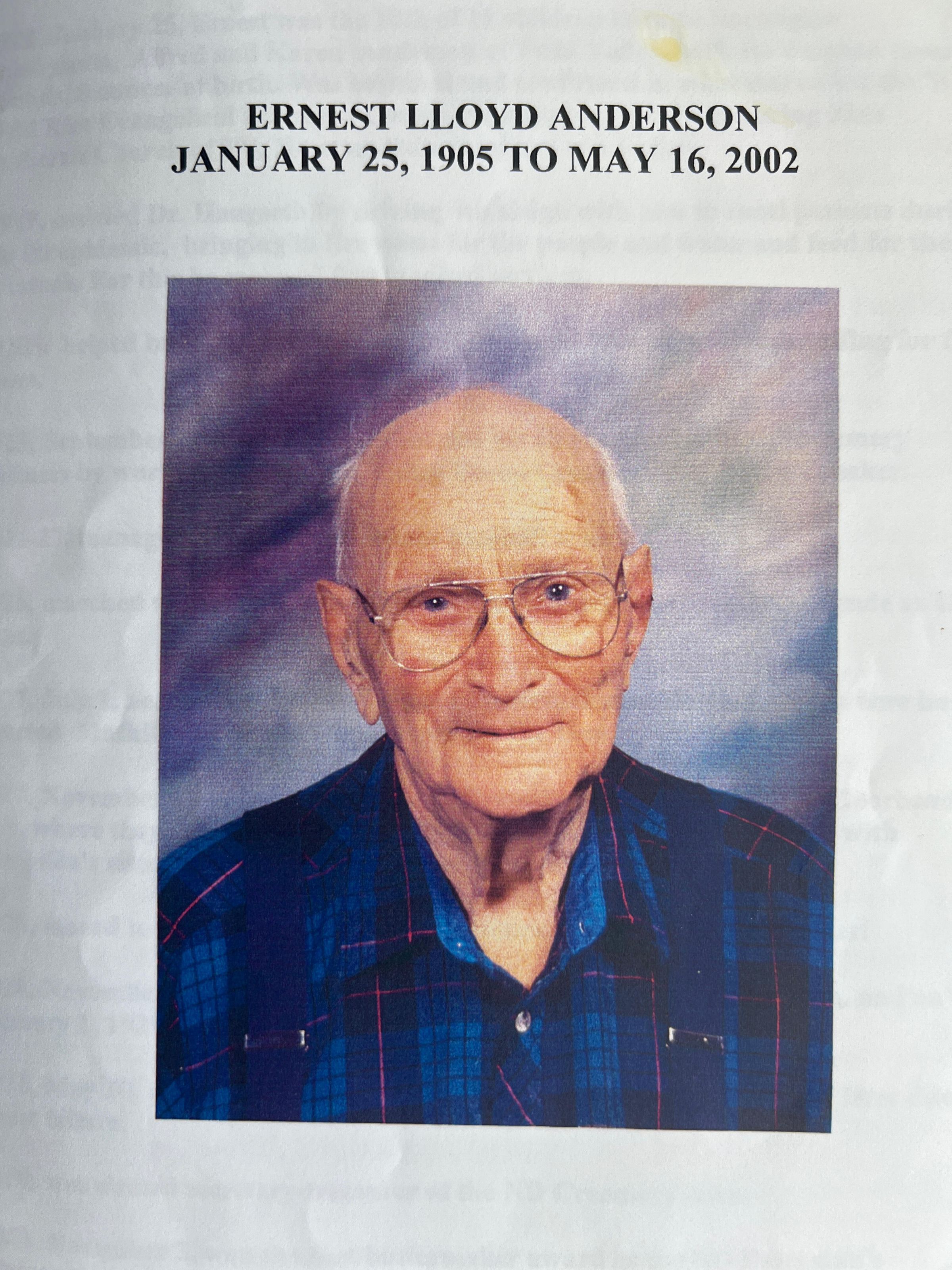 This family history file for Ernest Anderson is a printed timeline of his life from 1905 to 2002 when Ernest passed away on 16 May.Cataloged By