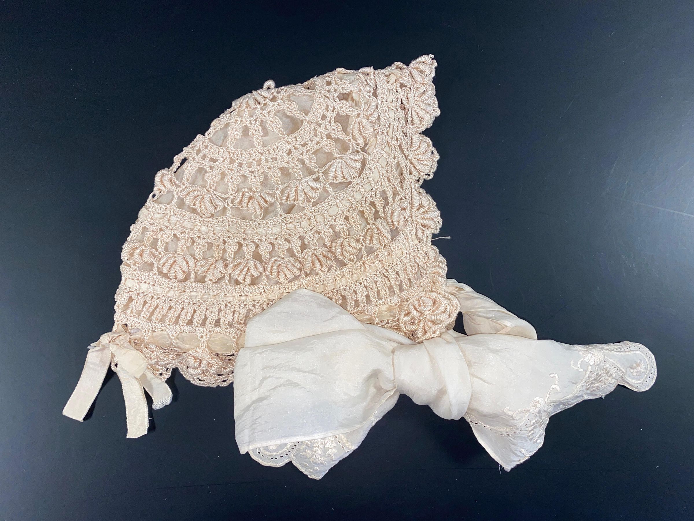 Child’s beige crocheted hat with wide silk ties that embroidered on the ends.