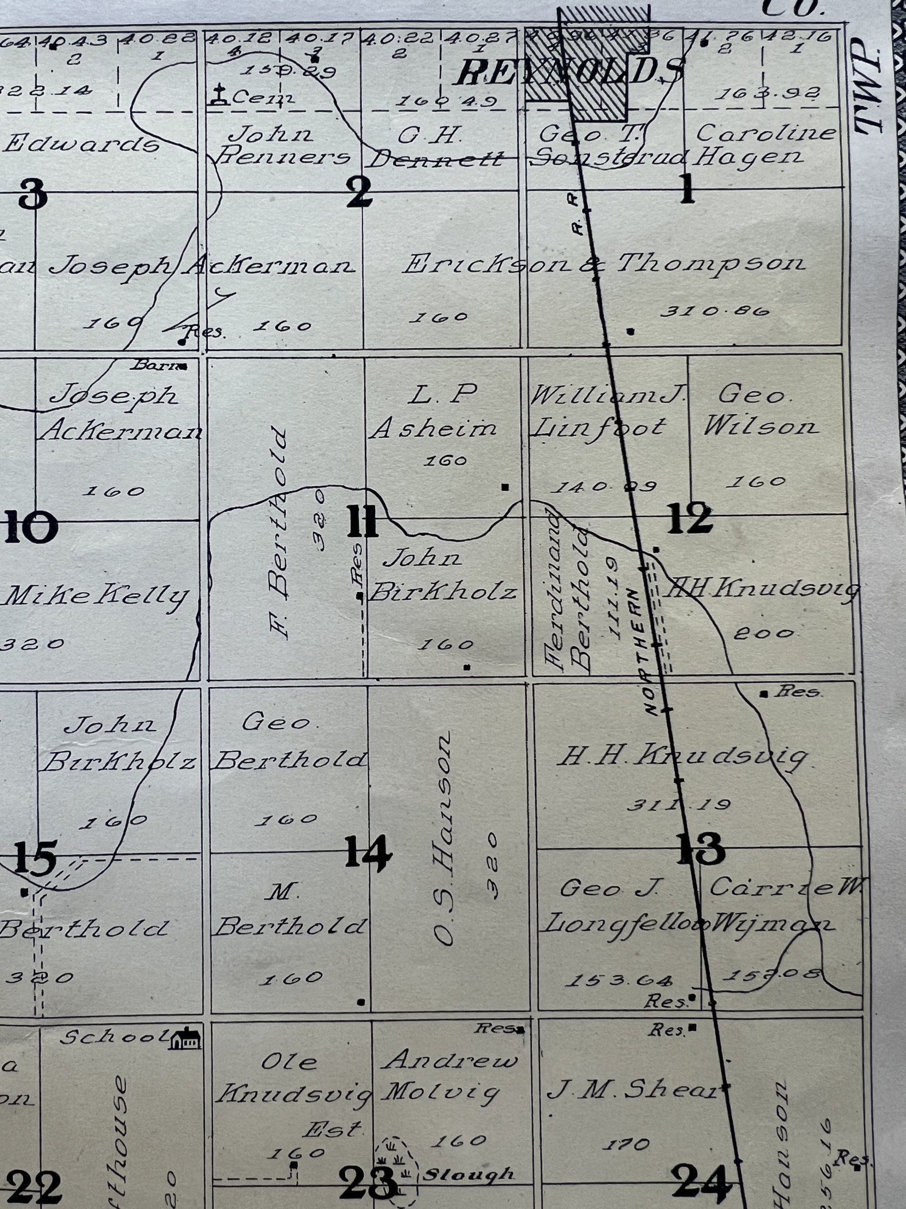 The Buxton Township plat map in the 1909 Traill County Atlas shows with a black dot that Michael and Helena Berthold's farmstead was located in the southeast corner of the SW Qtr. of Sect. 14. Their son Ferdinand had a farmstead located in the SW Qtr. of Sect. 11, and son Georg had a farmstead in the SW Qtr. of Sect. 15.