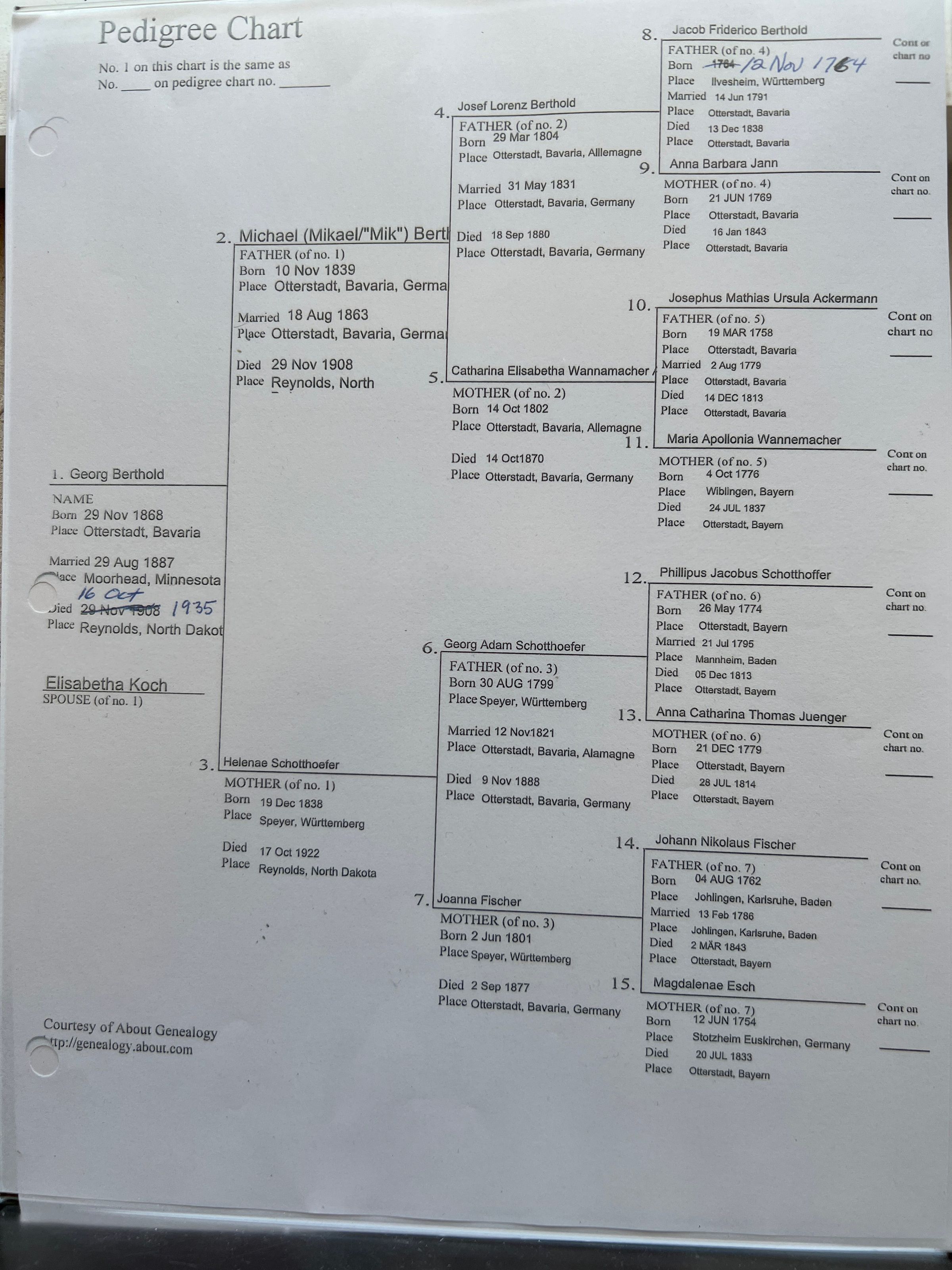 Michael and Helena came to the USA from Bavaria in 1882. Tax records for Buxton Township in Traill County document that they settled on a farm in the SW Qtr. of Section 14 and also had the SW Qtr. of Section 11. By 1895, Michael had transferred the 160 acres in Section 11 to his son, Ferdinand Berthold, and also in 1895 Georg Berthold was the owner of the SW Qtr. of Section 15 in Buxton Township.