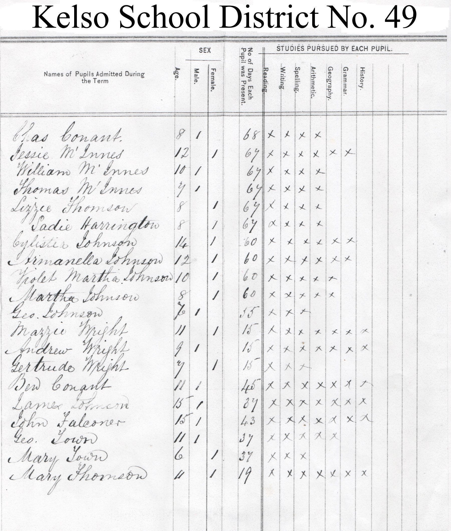 In 1884, from April to August, teacher Alex Falconer instructed 20 students in ages from 6 to 15, including Ben Conant, Chas Conant, John Falconer, Sadie Harrington, Armanella Johnson, Cylistia Johnson, Geo. Johnson, James Johnson, Martha Johnson, Violet Johnson, Jessie McInnes, Thomas McInnes, William McInnes, Lizzie Thomson, Mary Thomson, Geo. Town, Mary Town, Andrew Wright, Gertrude Wright, and Mazzie Wright.