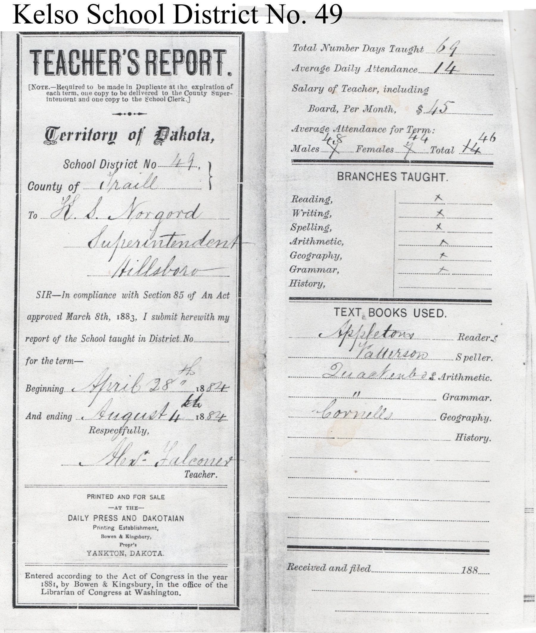 Kelso School District No. 49, 1884 Teacher's ReportEntry/Object ID